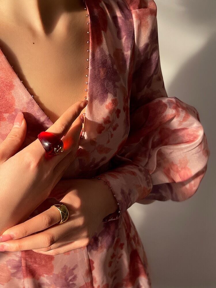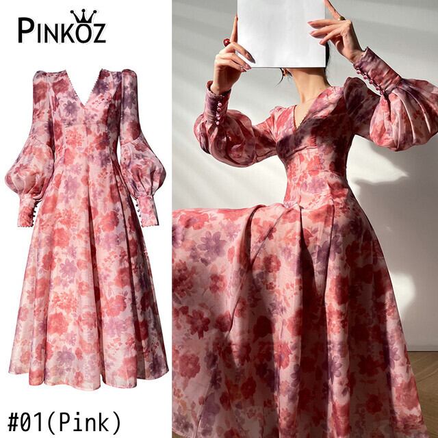 Pinkoz ヴィンテージ花柄プリントミディドレス v ネックビーズ高級ナイトパーティーロングドレスランタンスリーブ vestidos ファッション ピンク Vネック ビンテージ