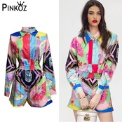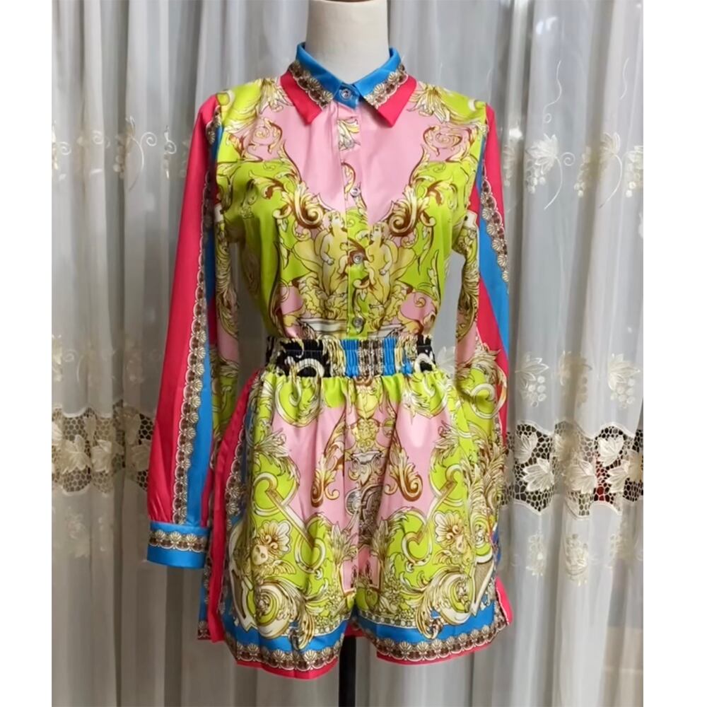 Pinkoz デザイナー 2 点セット ブレスト ターン ダウン襟長袖シャツ カジュアル トップス ショート パンツ スーツ ファム服 za ロング ピンク フェミニン