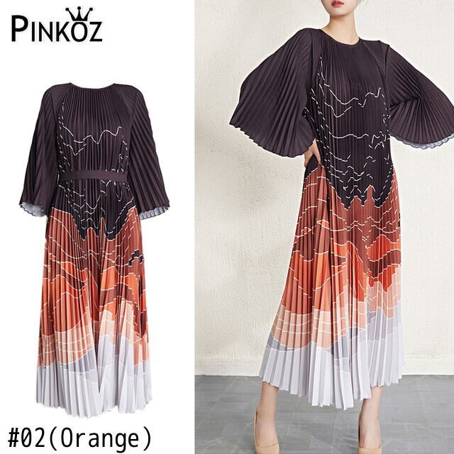 Pinkoz 滑走路デザイナー フレア スリーブ o ネック プリーツ マキシ ドレス プリント カジュアルエレガント ルーズ サイズ大き vestidos ヴィンテージ新しい ピンク フレアスリーブ Oネック ビンテージ
