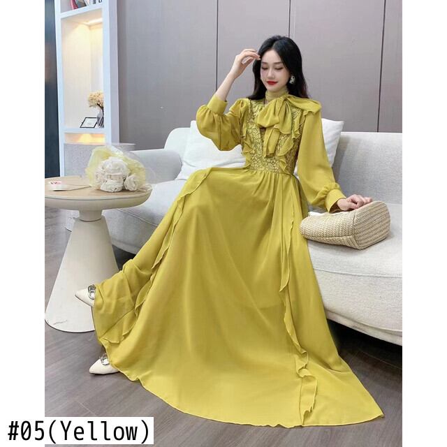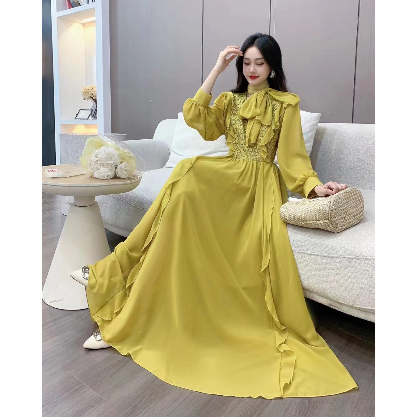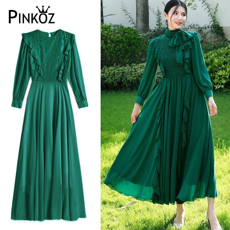 Pinkoz 滑走路デザイナー ダーク グリーンマキシ ドレス フリル O ネック パーティー エレガントトラフ ヴィンテージ vestidos レースアップ リボン服 ピンク ラッフル Oネック ビンテージ
