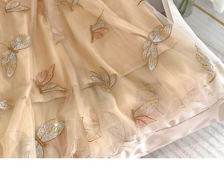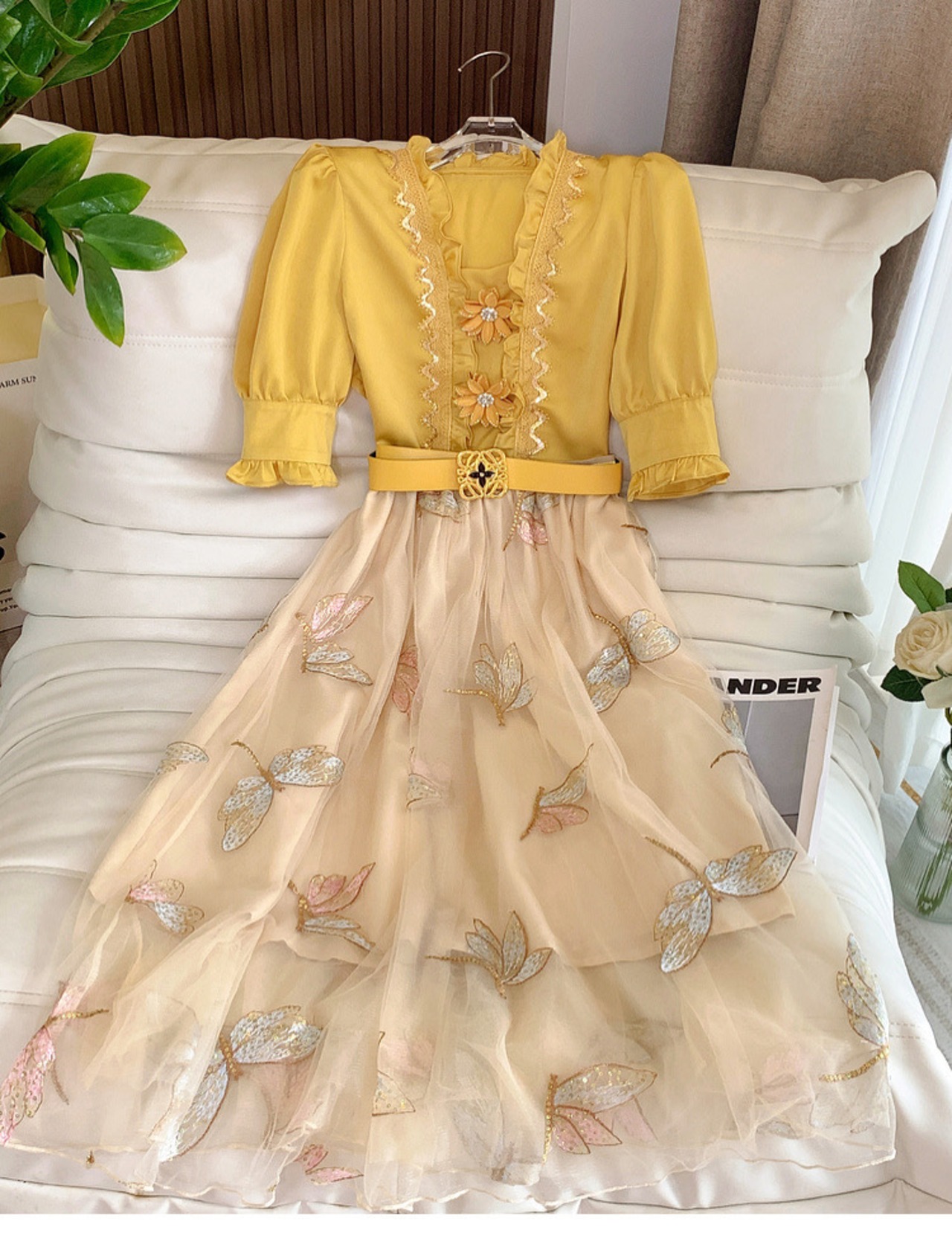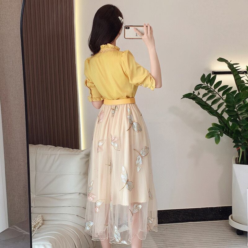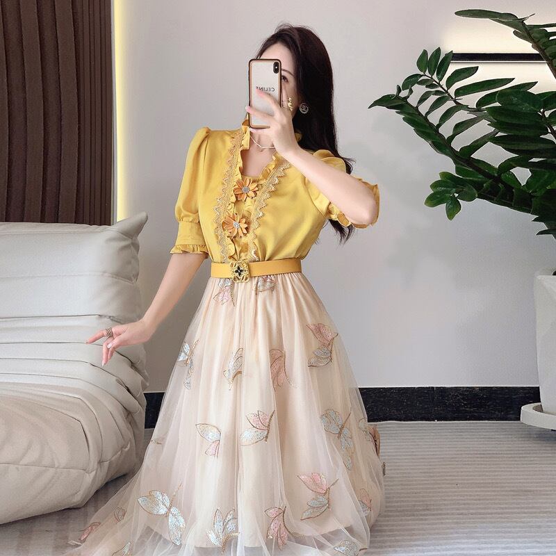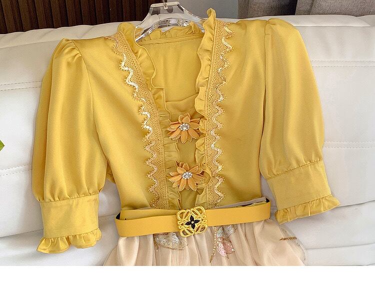 Pinkoz ランウェイ デザイナー イエロー Vネック 半袖 ブラウス アップリケ 刺繍入り トップス メッシュ刺繍 スカート ファム 衣類 トラフ ショート ピンク ハーフスリーブ フェミニン