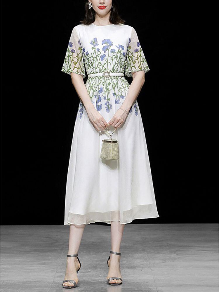 Pinkoz 新夏ミディドレス花柄プリントシフォンエレガント作業服 OL vestidos ヴィンテージ夏ドレス ピンク サマー 夏物 ビンテージ