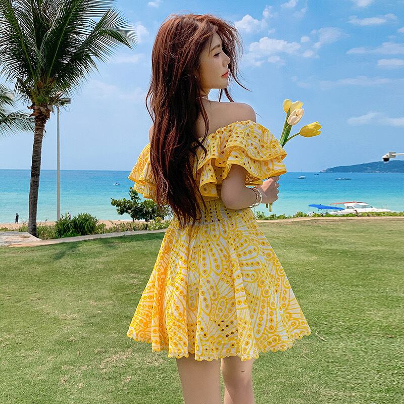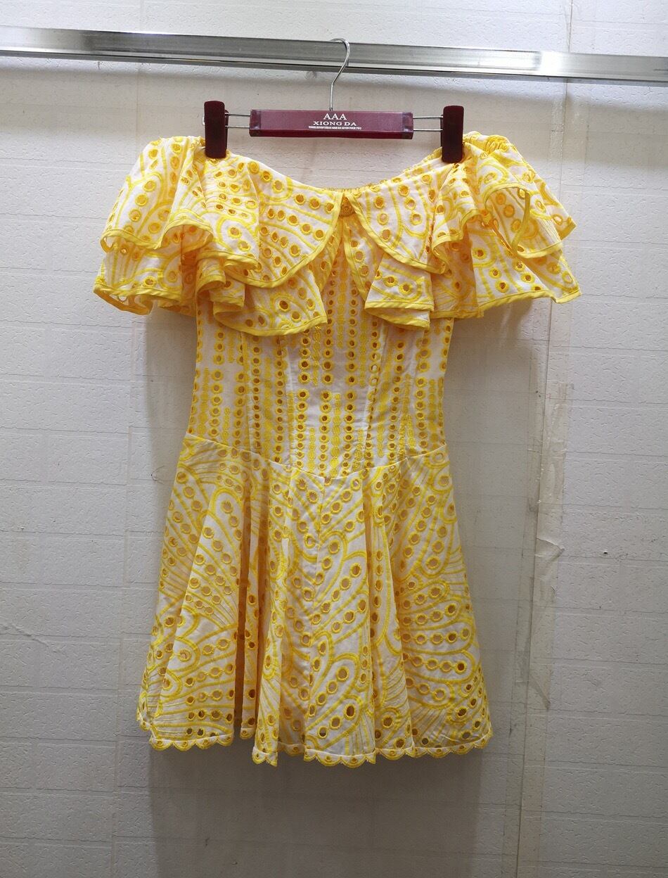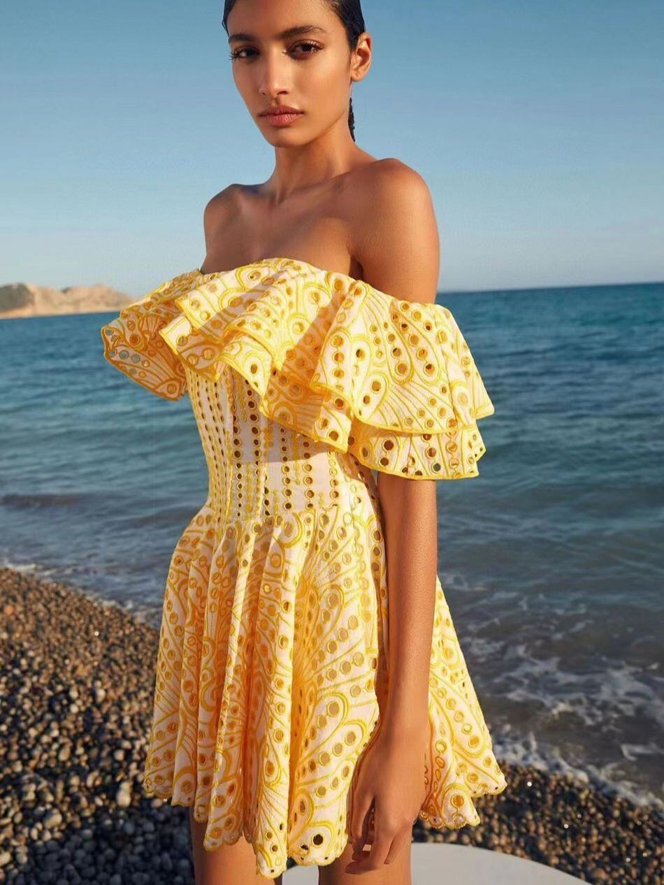 Pinkoz デザイナースラッシュネックバタフライスリーブイエローレース中空アウトミニドレスパーティーナイトファッションハイストリート traf ピンク