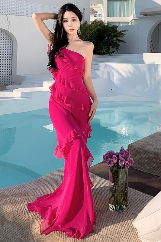 Pinkoz womemaxi ドレス ブルゴーニュ フリル ワンショルダー パーティー ナイト ロング ドレス ぬるぬる イブニング ナイト vestidos ローブ デ mujer ファッション ピンク ラッフル