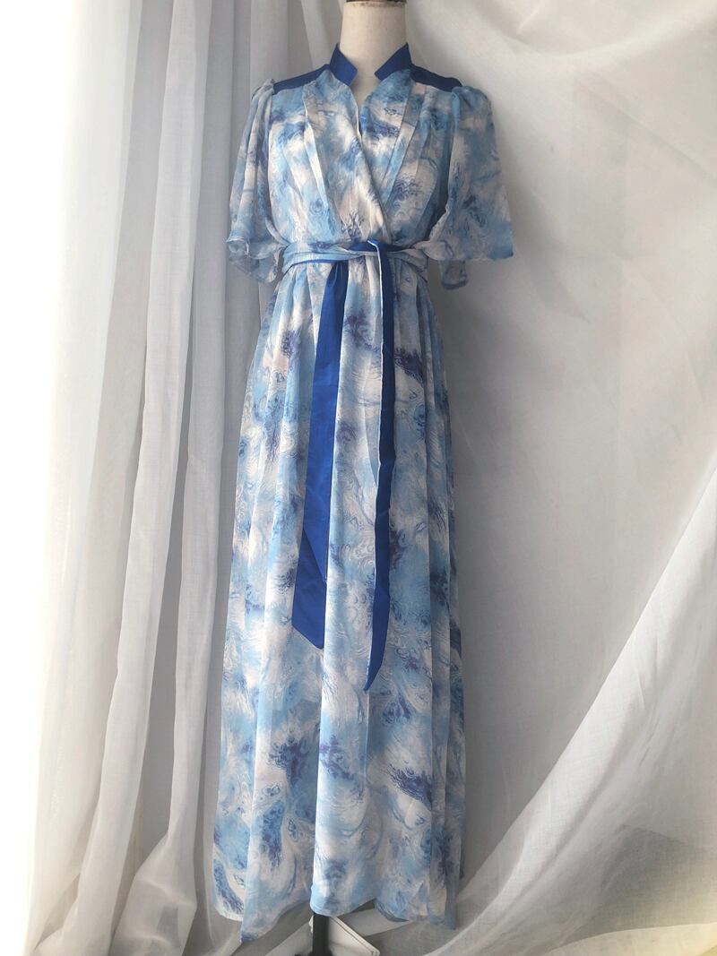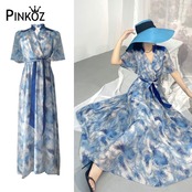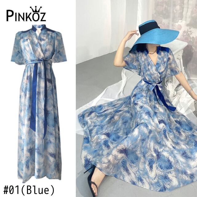 Pinkoz デザイナー新ファッションブループリントシフォンマキシドレスパッチワーク半袖 v ネックレースアップパーティーエレガントベストベルト ショート ピンク ハーフスリーブ ハーネス Vネック