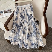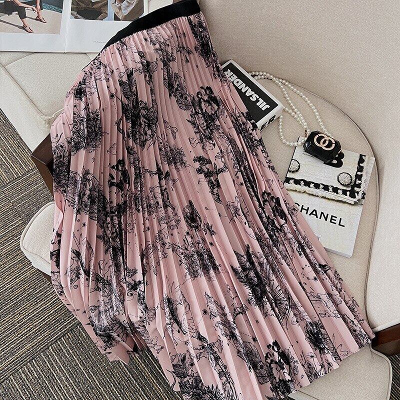 Pinkoz ランウェイ デザイナー グリーン リーフ フローラル プリント ハイ ワシット 伸縮性 プリーツ マキシ ロング スカート エレガント オフィス レディ シック 衣類 za ピンク エラスティック 花柄 会社 学校 通勤や通学にも