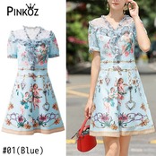 Pinkoz 夏 半袖 Aライン ドレス Vネック パッチワーク シャーリング 水色 角柄 プリント エレガント シック ドレス ベスト ショート ピンク ブルー ハーフスリーブ サマー 夏物