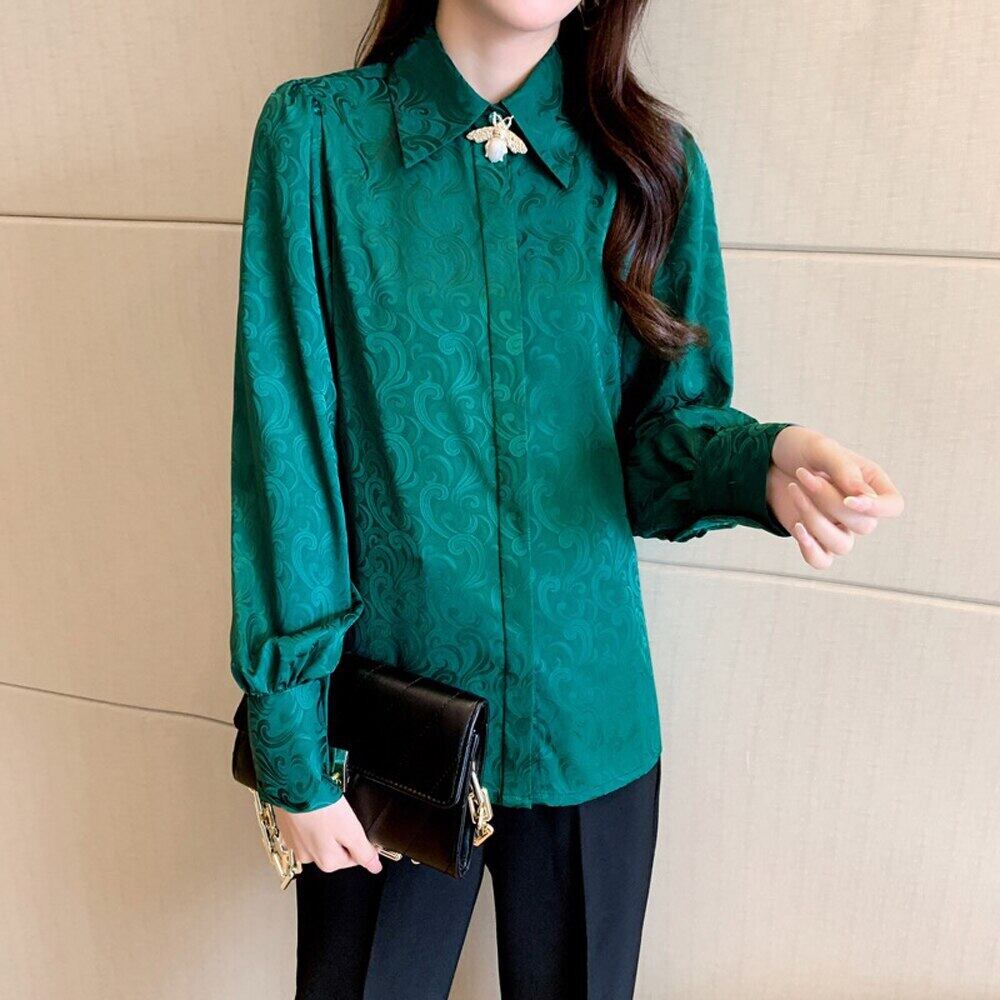 Pinkoz ダークグリーンブラウスプリントフルランタンスリーブターンダウン襟ヴィンテージビーボタンアップリケシャツ ladt シックトップス ピンク ビンテージ