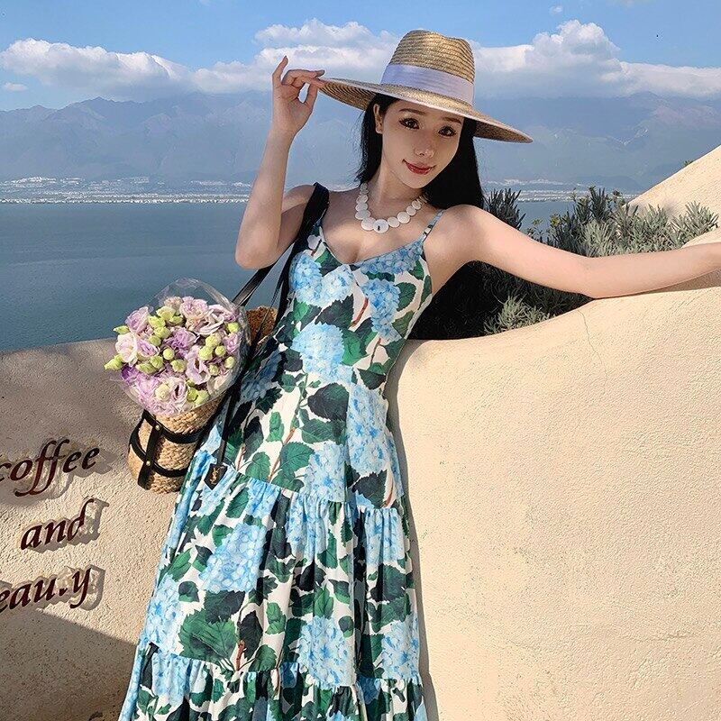 Pinkoz 滑走路デザイナー花青スパゲッティ ストラップ マキシ ドレスホリデー シックパーティー ドレス自由奔放生きるローブ デ mujer ファッション ピンク ブルー 花柄