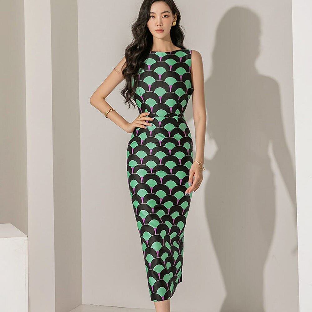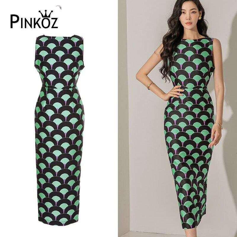 Pinkoz 韓国ファッションダークグリーン花柄プリントミディペンシルドレス作業服エレガントドレス ピンク