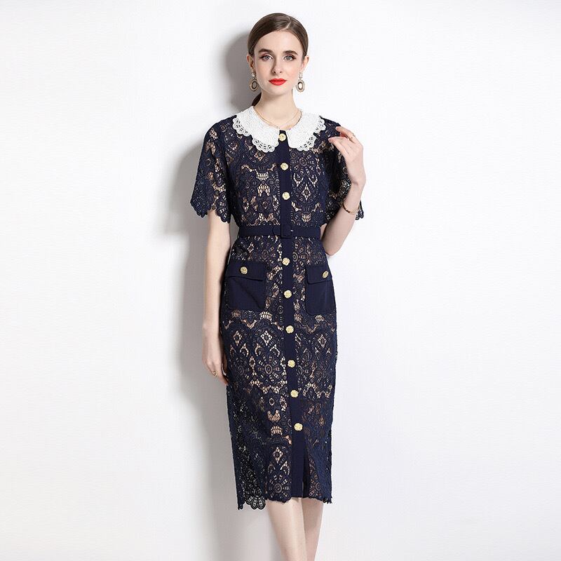 Pinkoz レースドレス紺 singlebreasted ポケット ピーターパン襟鉛筆エレガント vestidos ヴィンテージ高級服 za ピンク ブルー ビンテージ