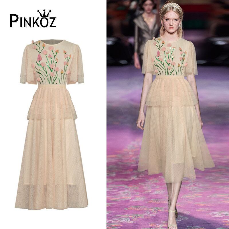 Pinkoz デザイナー滑走路高級ベージュ水玉蝶袖ミディドレス刺繍フラワーレイヤード甘いビッグサイズ Vestidos za ピンク レッド 大人ガーリー スウィート キュート カジュアル フラワーデザイン