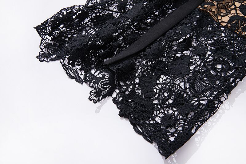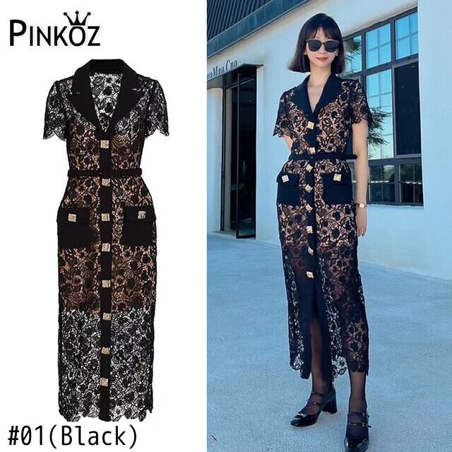 Pinkoz runwya デザイナーブラックレースペンシルドレスターンダウンカラーシングルブレスト中空アウト高級ボタンパーティーエレガントローブ z ピンク
