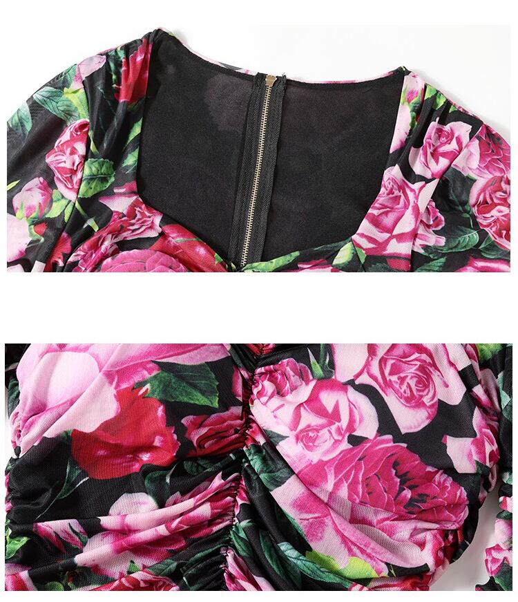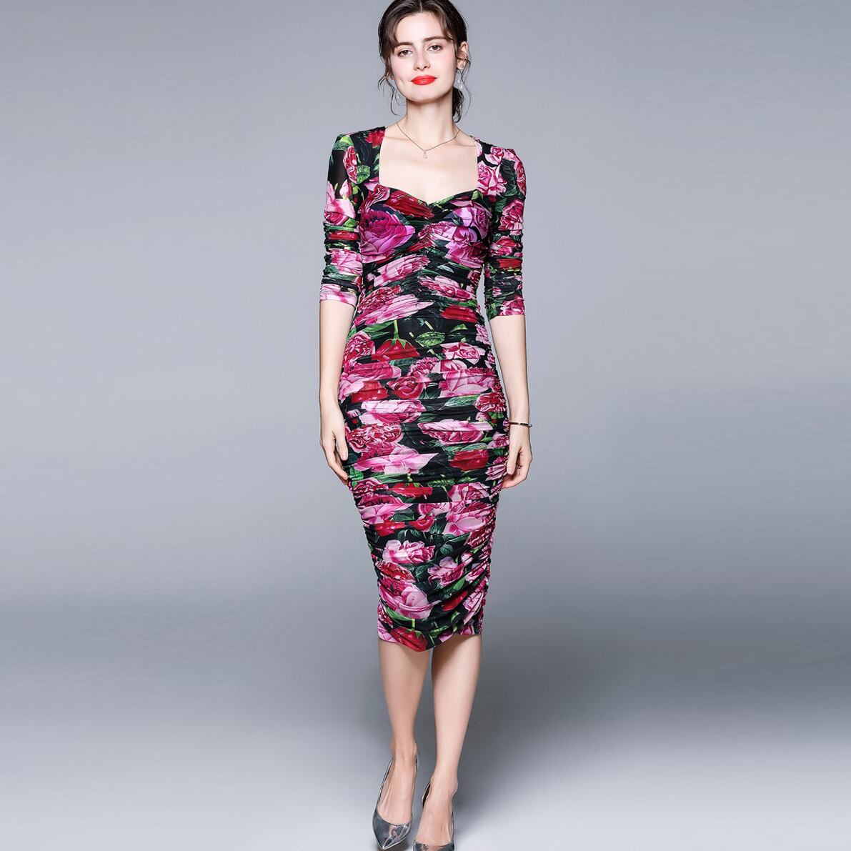 Pinkoz デザイナースタイルフラワープリント紫ぬるぬるミディドレス倍スクエアカラーボディコンパーティードレスローブボヘミアン ピンク フラワーデザイン パープル スクウェア