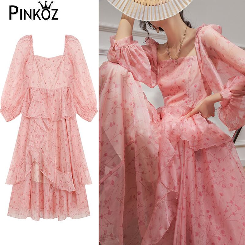 Pinkoz 夏ミディ花柄プリントドレスフリルスクエアカラー長袖スウィーティーかわいいホリデー誕生日パーティードレス traf ロング ピンク ラッフル 大人ガーリー スウィート キュート カジュアル サマー 夏物 スクウェア