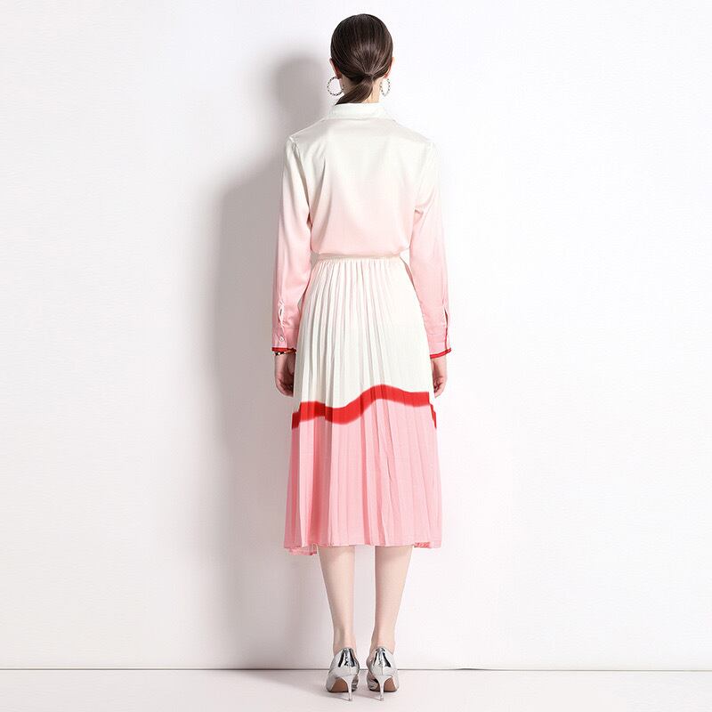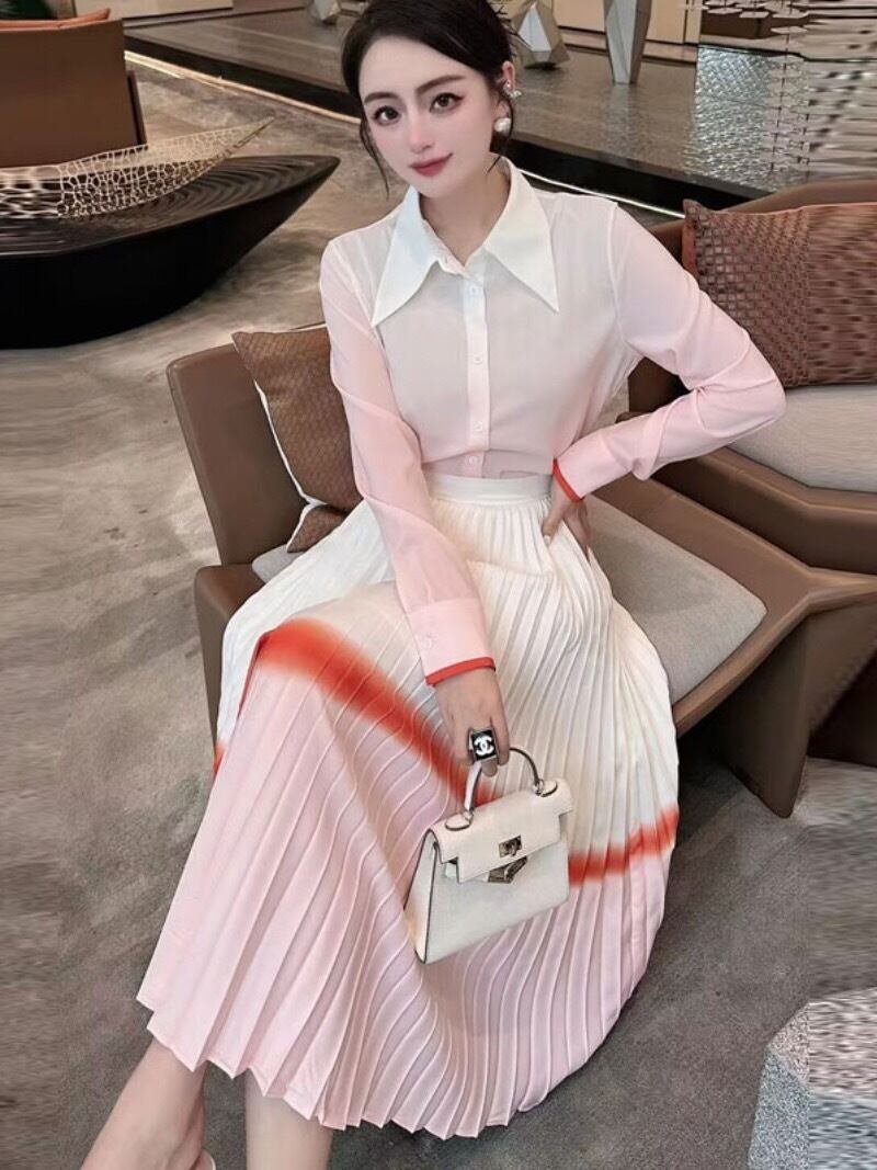Pinkoz 滑走路デザイナーピンク 2 枚セットストライプ白ターンダウン襟エレガントシャツブラウストップスプリーツスカート服 ホワイト