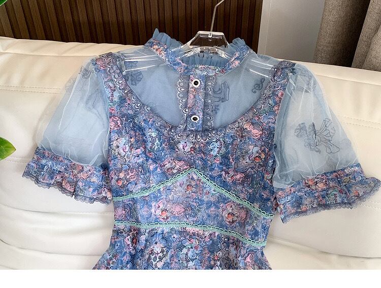 Pinkoz 滑走路デザイナーぼかし花柄プリントパッチワークレースミディドレスシャーリングファッション Vestidos ヴィンテージナイトローブフレンチ ピンク ビンテージ