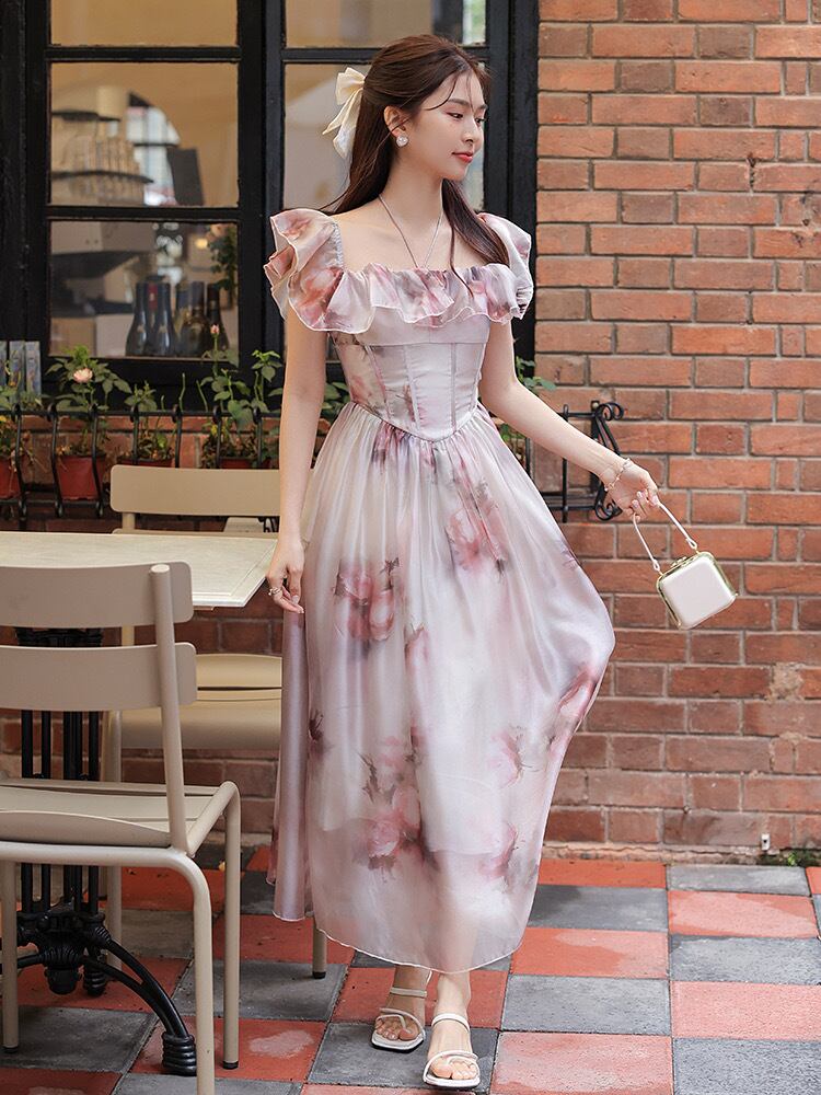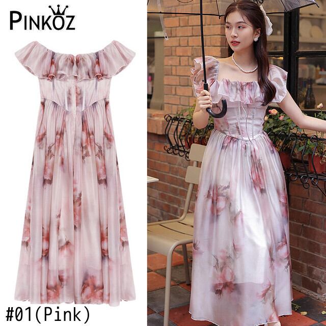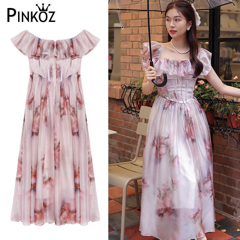 Pinkoz ヴィンテージ Vestidos 夏 mixi ドレス花柄プリントピンクスラッシュネックフレンチシックファッション甘いかわいいローブ tr 大人ガーリー スウィート キュート カジュアル サマー 夏物 ビンテージ
