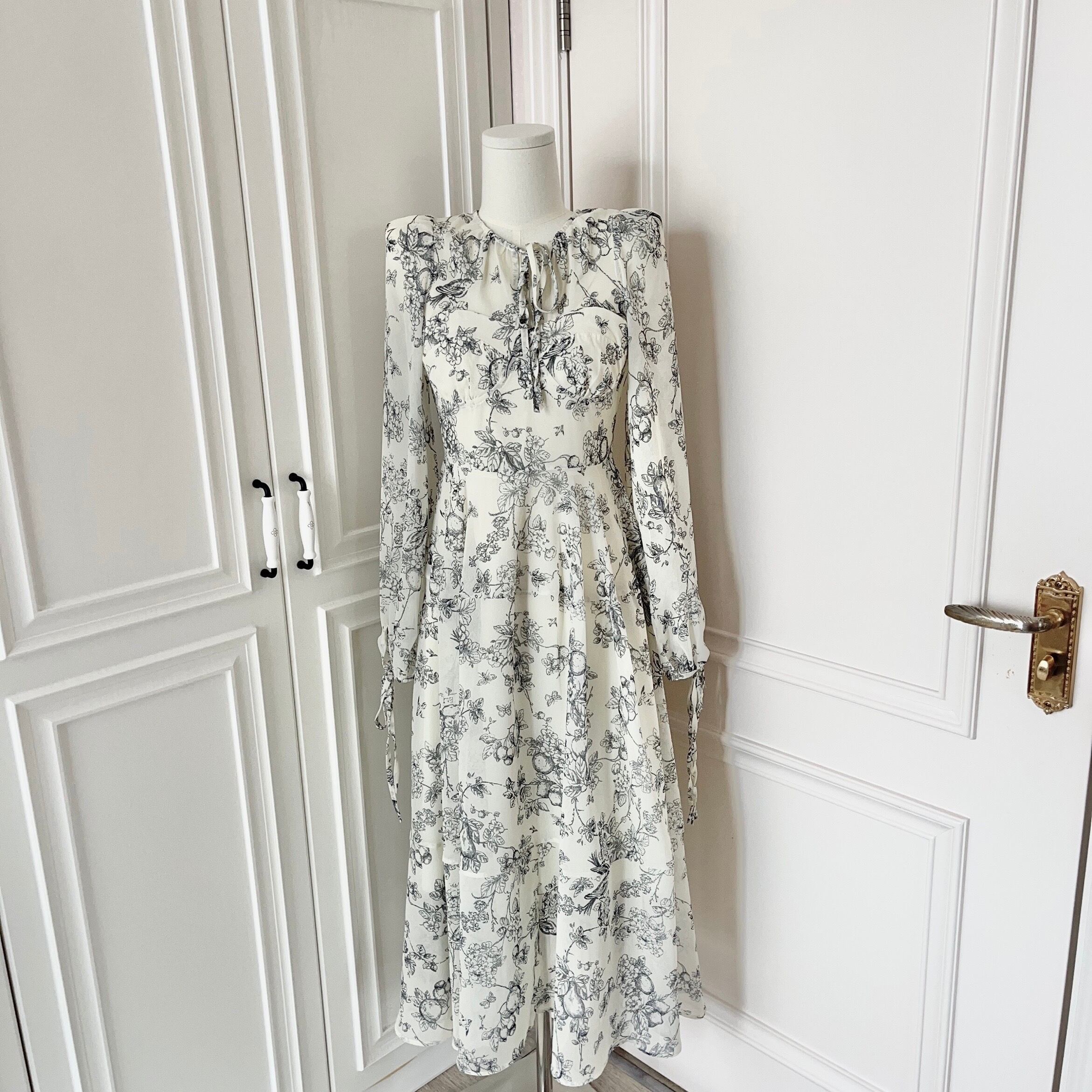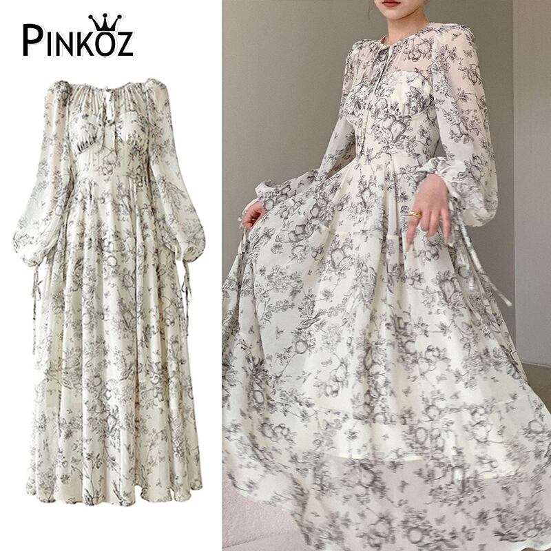 Pinkoz デザイナーグレー花柄プリント o ネックランタンスリーブ A ラインミディドレス夏夜カジュアル服 traf ピンク サマー 夏物 Oネック Aライン