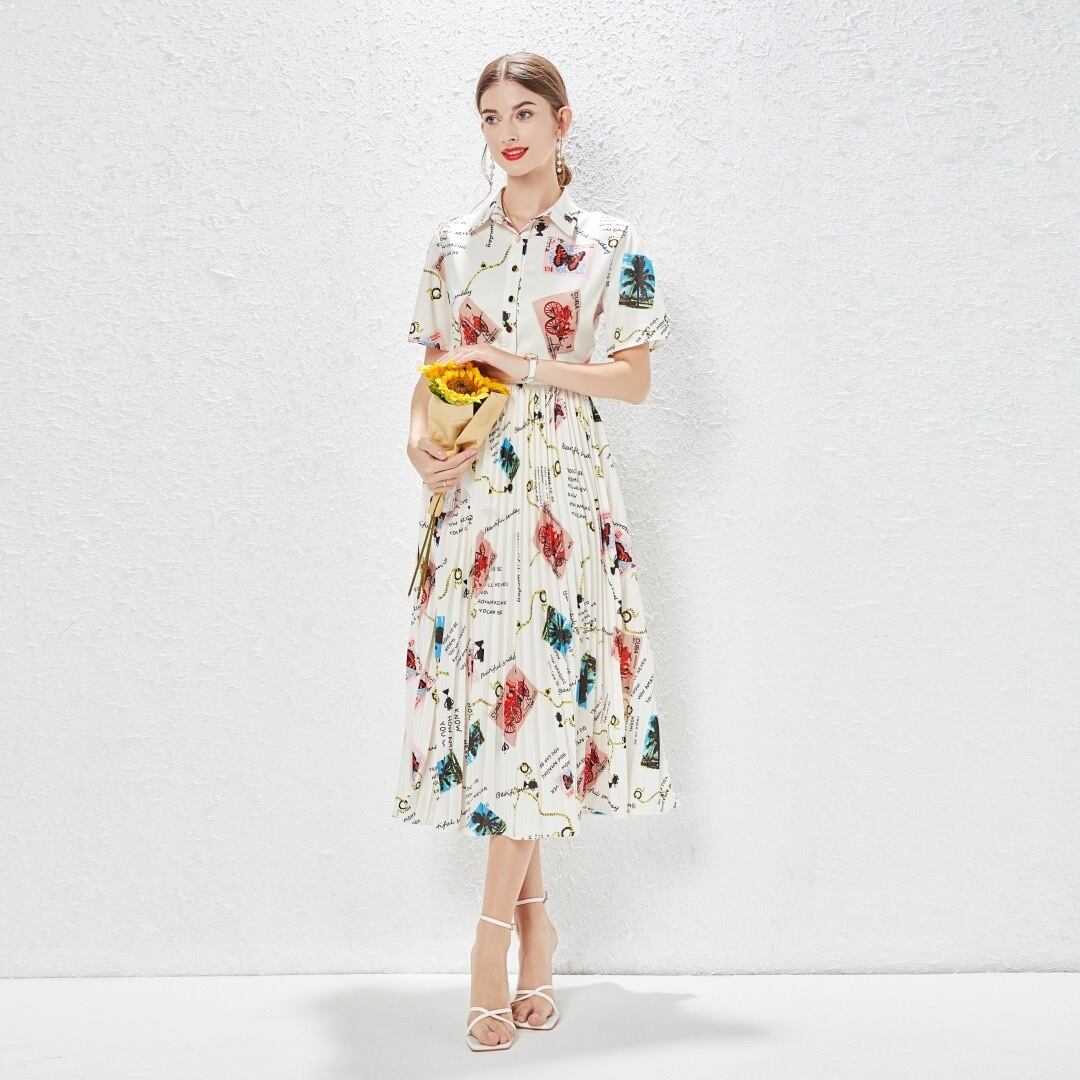 Pinkoz 白花柄ドレスターンダウン襟夏ミディファッションドレス休日エレガント作業ローブデ mujer ベスト ピンク ホワイト サマー 夏物