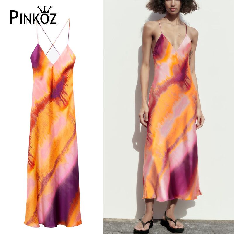 Pinkoz オレンジ紫スパゲッティストラップセクシーミディドレス背中開いた v ネックキャミソール夏ビーチvestidos ファッションシック服 ピンク サマー 夏物 Vネック パープル