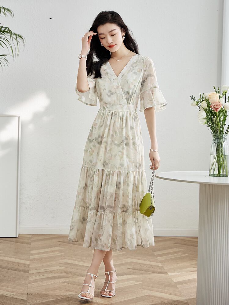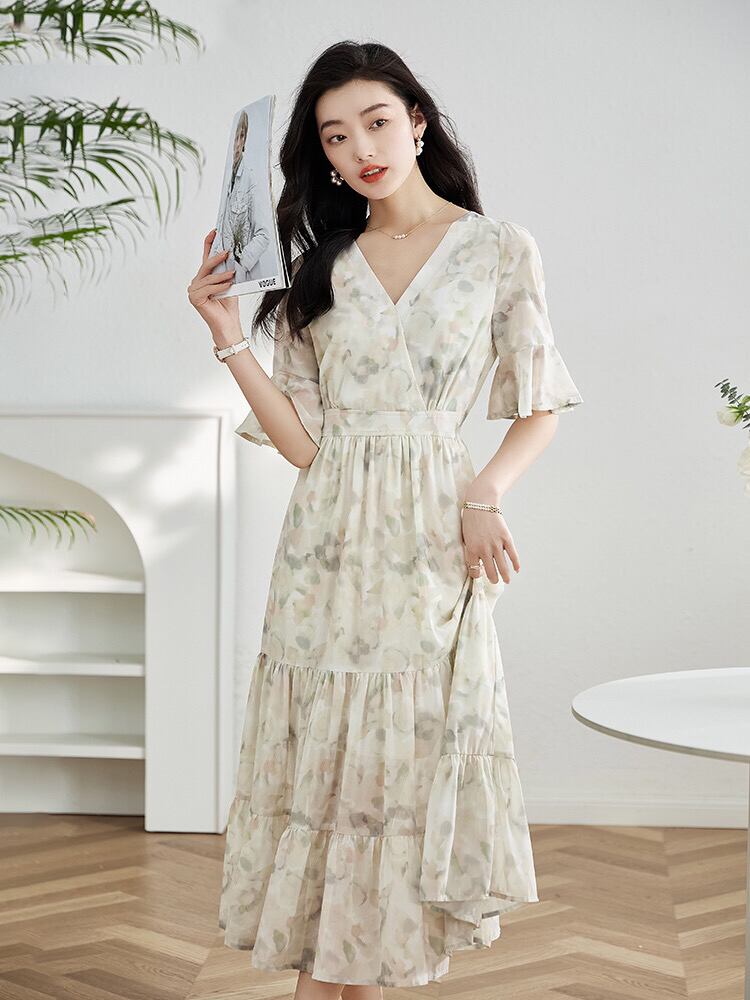 Pinkoz エレガントベージュ花柄プリント V ネック半袖 A ラインパッチワークカジュアルファッションロングドレス Vestidos ヴィンテージ traf ピンク ハーフスリーブ Vネック Aライン ビンテージ