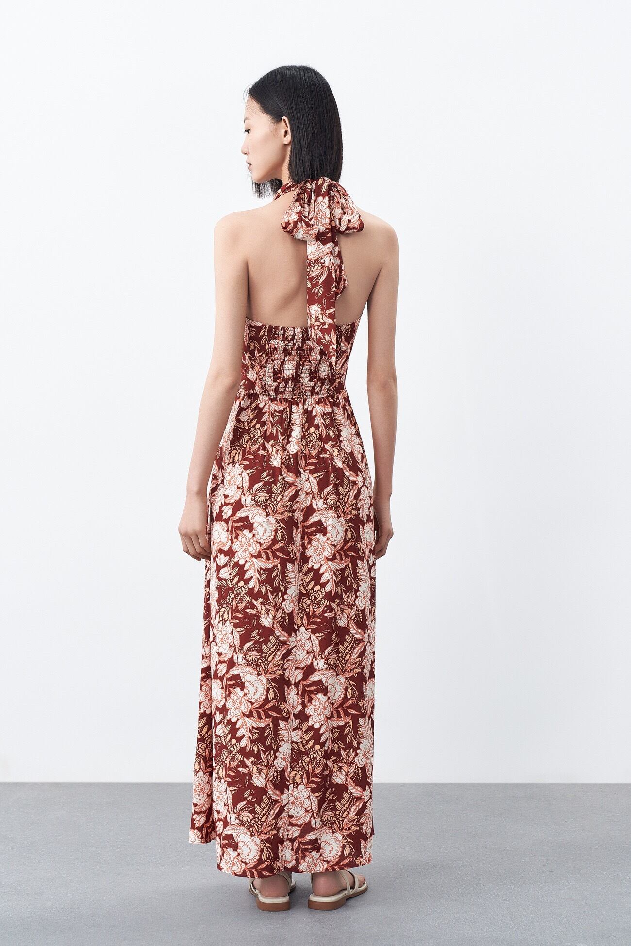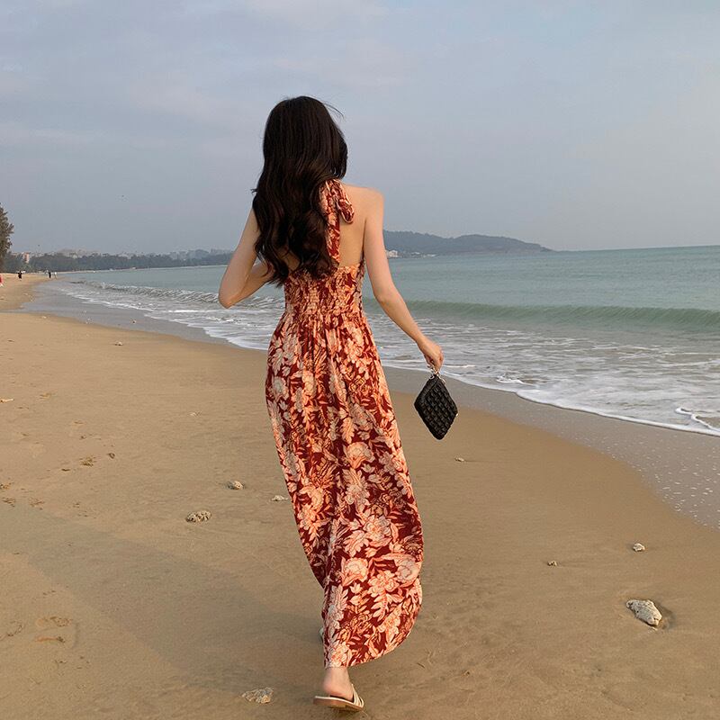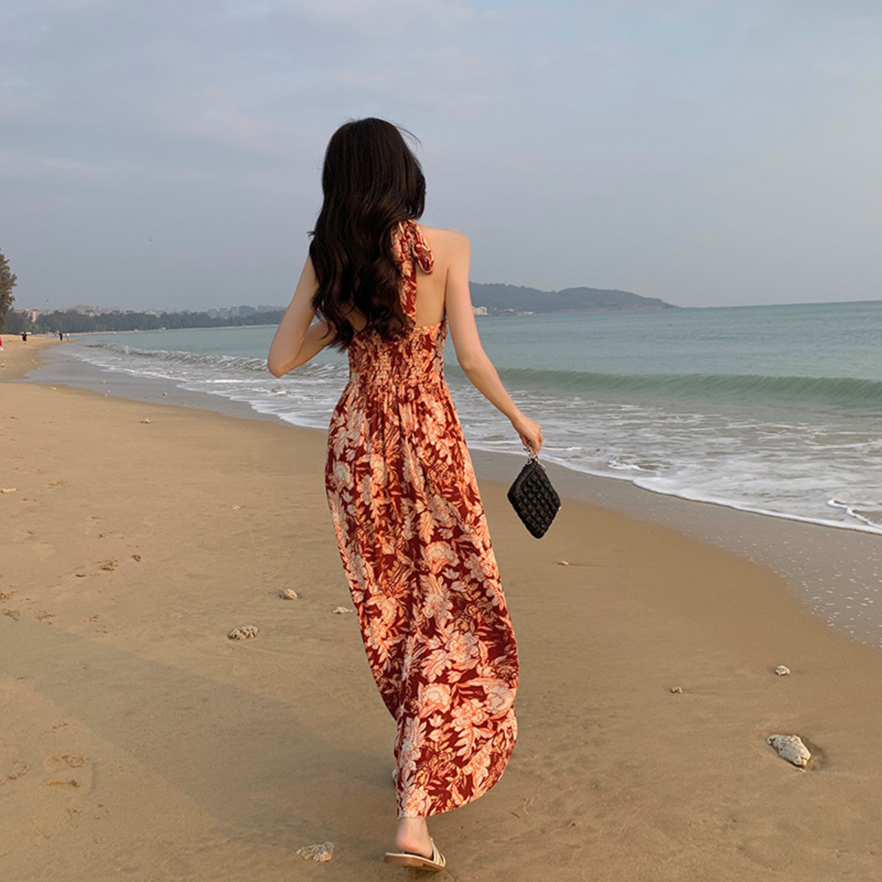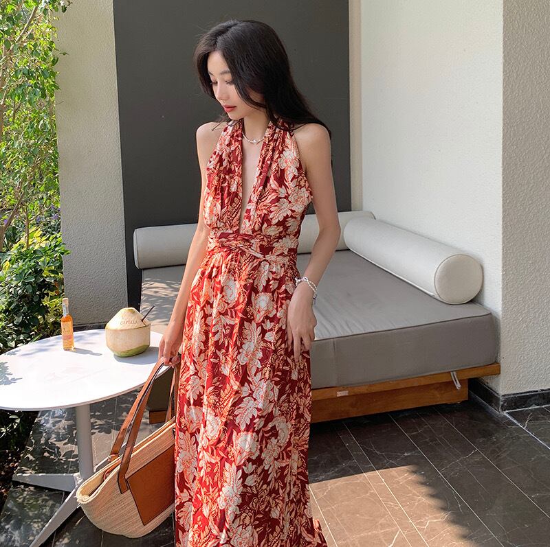 Pinkoz レッド花柄プリントマキシドレス v ネックホリデーパーティー夏ビーチカジュアルロングドレスvestidosデmujerファッションローブ ピンク サマー 夏物 Vネック