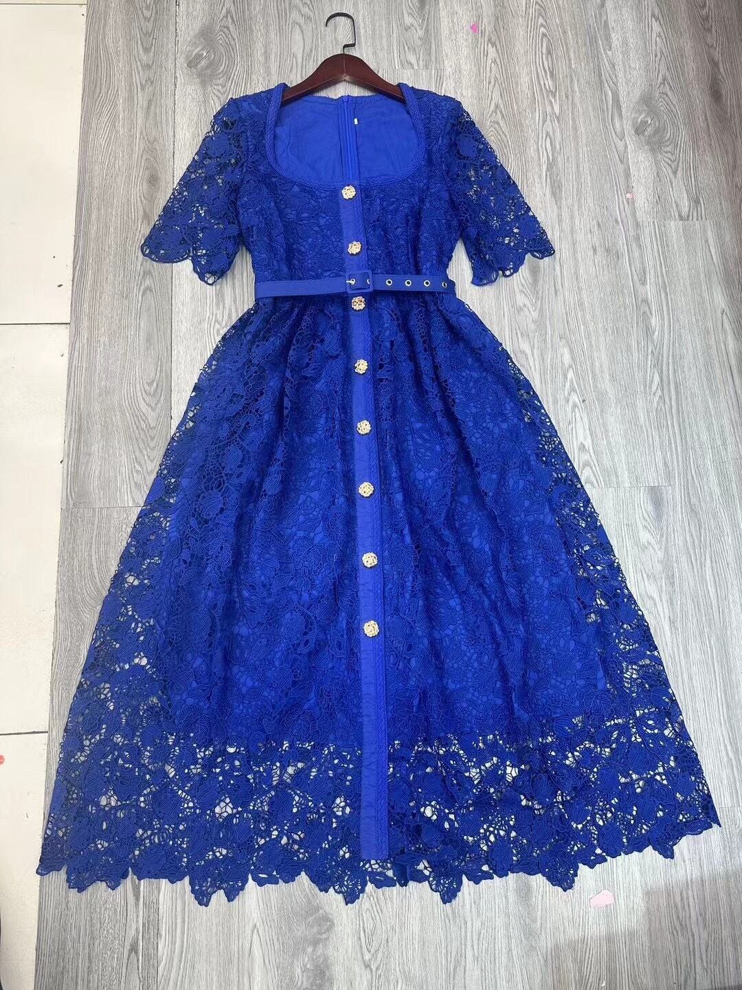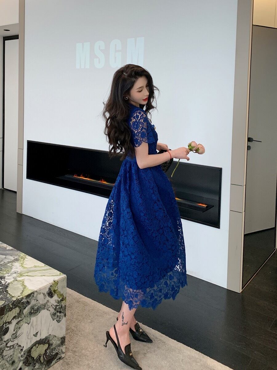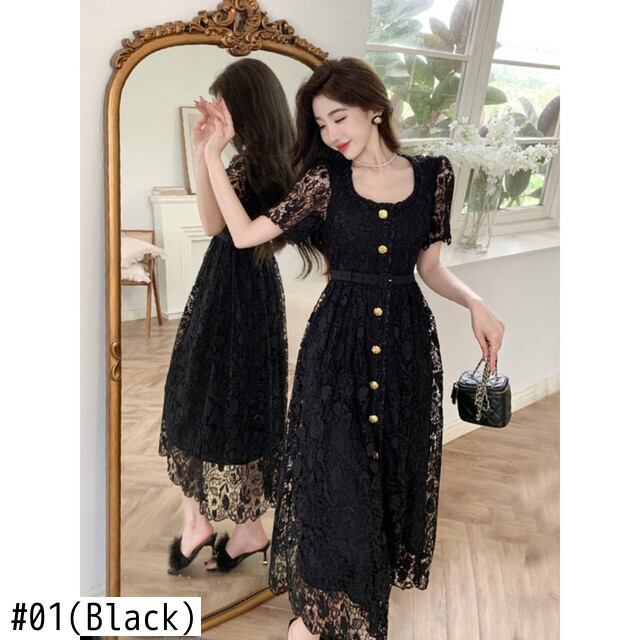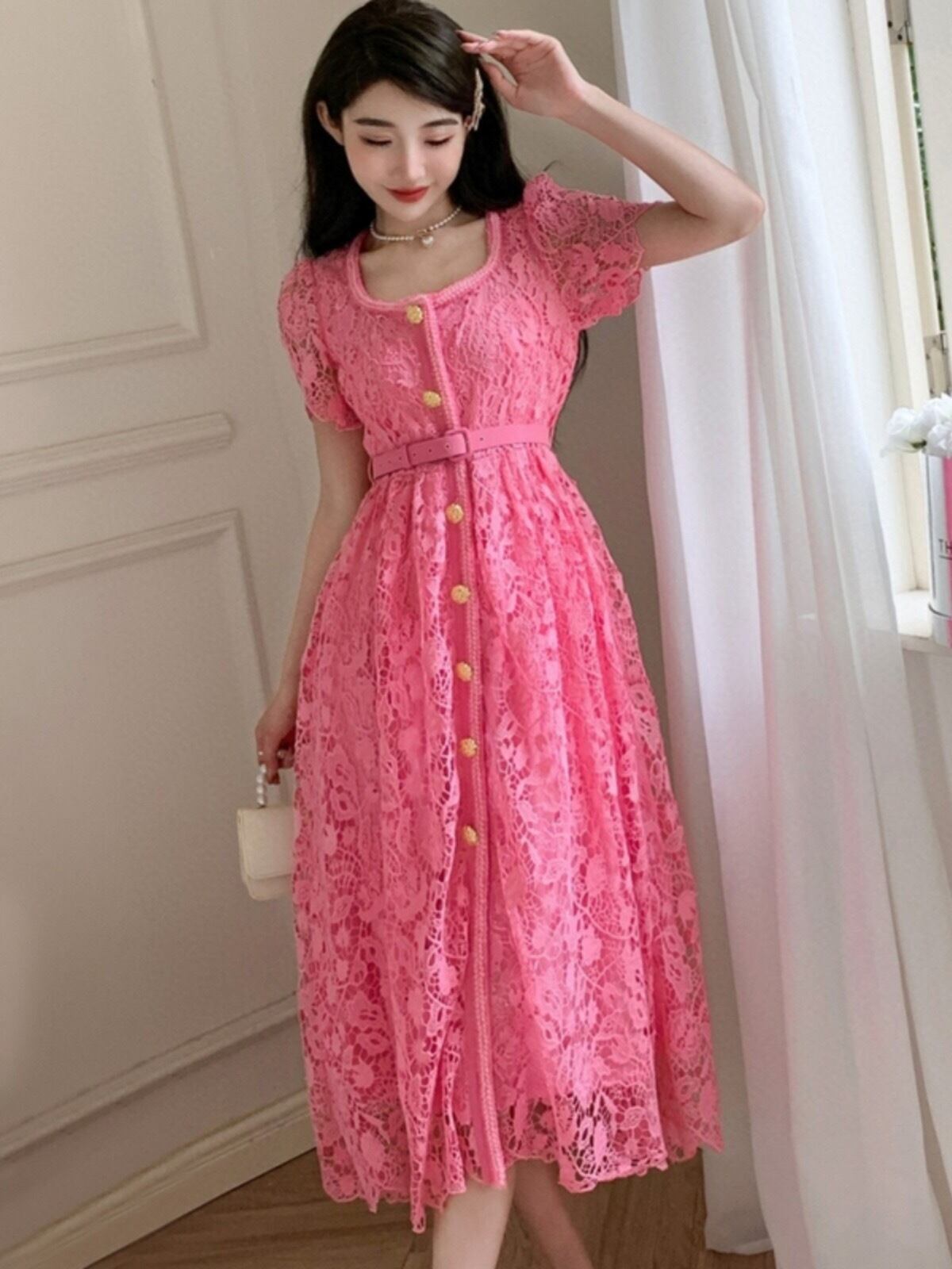 Pinkoz 夏半袖 U ネックエレガントミディレースドレス高級ゴールドボタンシングルブレスト OL シックパーティー Vestidos ヴィンテージ ショート ピンク ハーフスリーブ サマー 夏物 ビンテージ