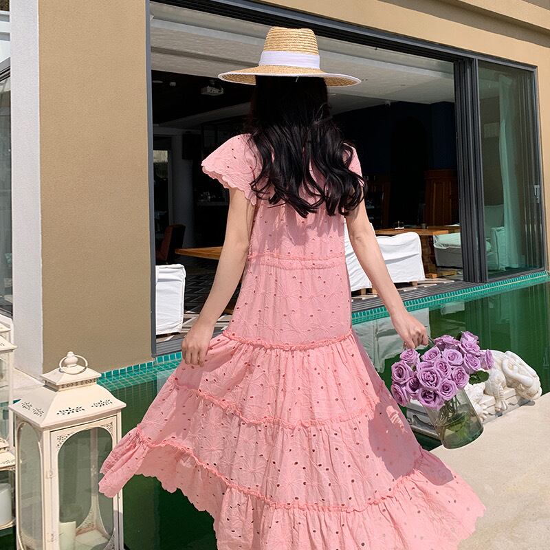 Pinkoz ピンクミディドレスレースアップストローストリング夏カジュアルファッションファムドレス緩い甘いかわいいレース綿 Vestidos ローブ コットン 大人ガーリー スウィート キュート サマー 夏物 フェミニン