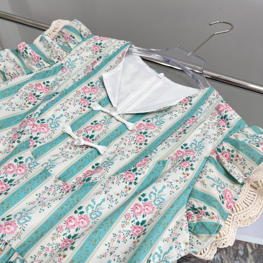 Pinkoz エレガントターンダウン襟パッチワークグリーンストライプ花柄ボタンミディドレスエレガント夏ボヘミアンナイトvestidosヴィンテージ ピンク サマー 夏物 ビンテージ