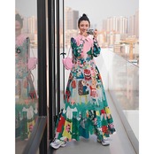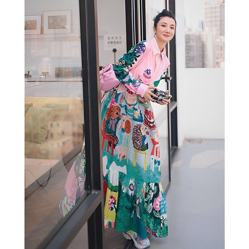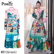 Pinkoz デザイナー花柄プリントターンダウン襟長袖ルーズサイズファムマキシドレス ロング ピンク フェミニン
