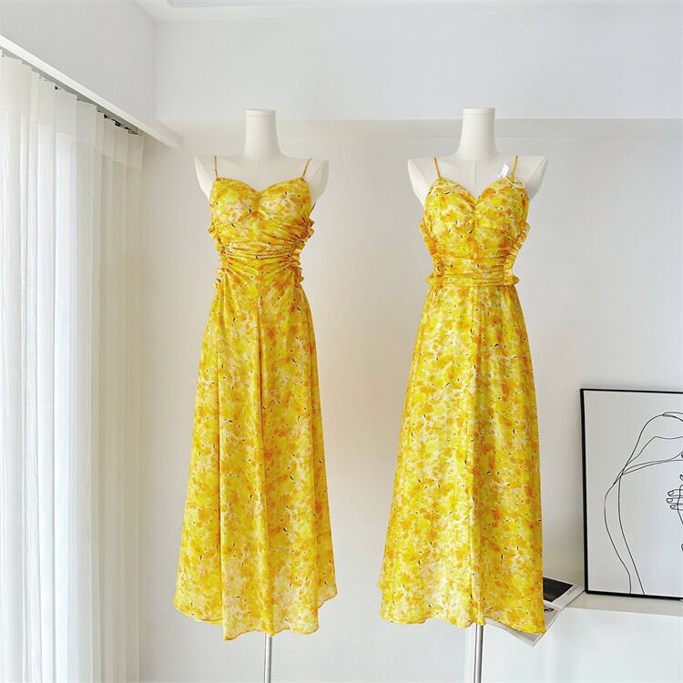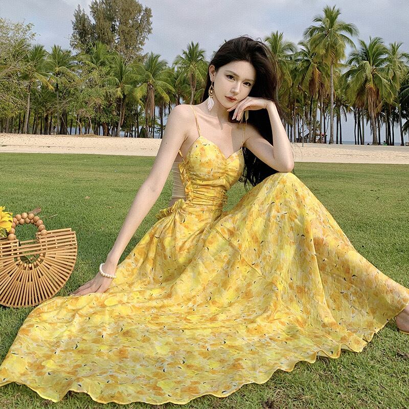 Pinkoz 夏スパゲッティストラップ黄色花柄マキシドレス背中開いた若い甘い自由奔放生きるローブデムジェ Vestidos traf ピンク 大人ガーリー スウィート キュート カジュアル サマー 夏物