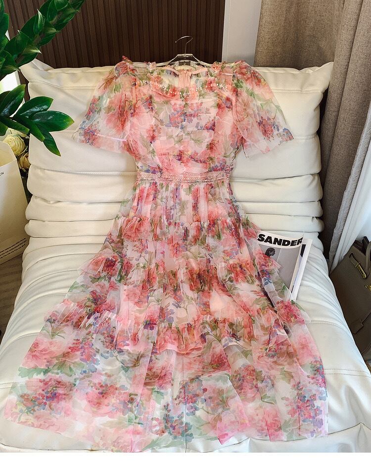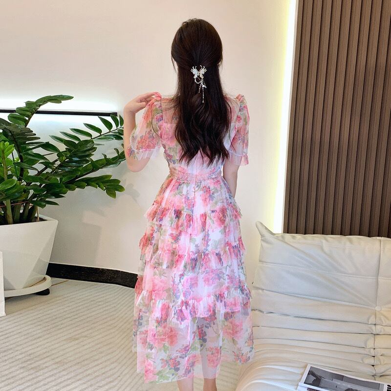 Pinkoz ピンクデザイナースクエアカラーメッシュシャーリングドレスミディロングぬるぬる甘いvestidosヴィンテージデmujerボヘミアンサマードレス 大人ガーリー スウィート キュート カジュアル 夏物 スクウェア ビンテージ
