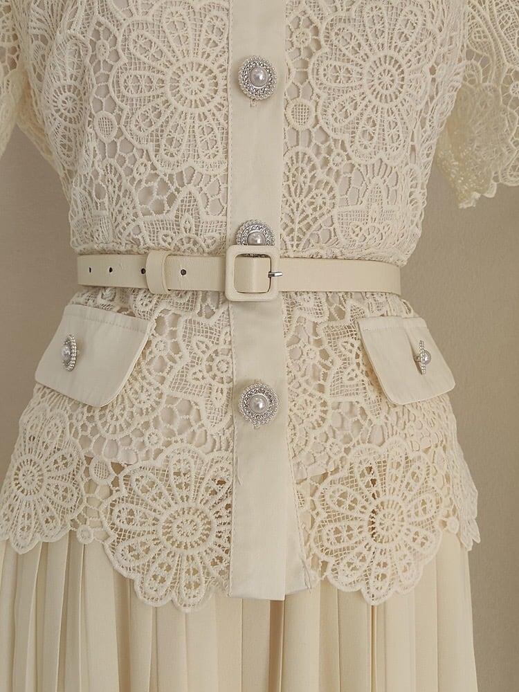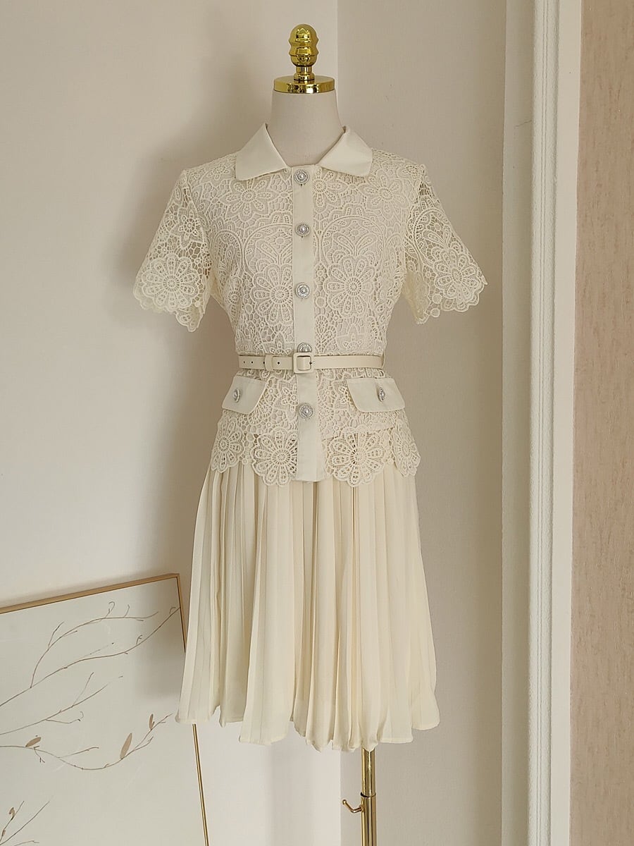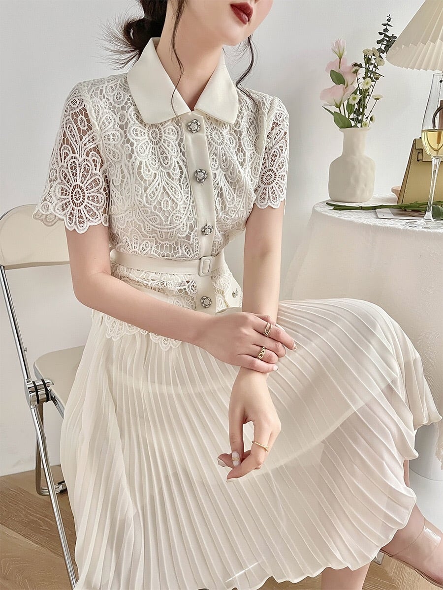 Pinkoz エレガントミディホワイトパッチワークレースプリーツドレスターンダウン襟春夏ファッションパーティードレスベルトローブ ピンク スプリング 春物 サマー 夏物 ハーネス