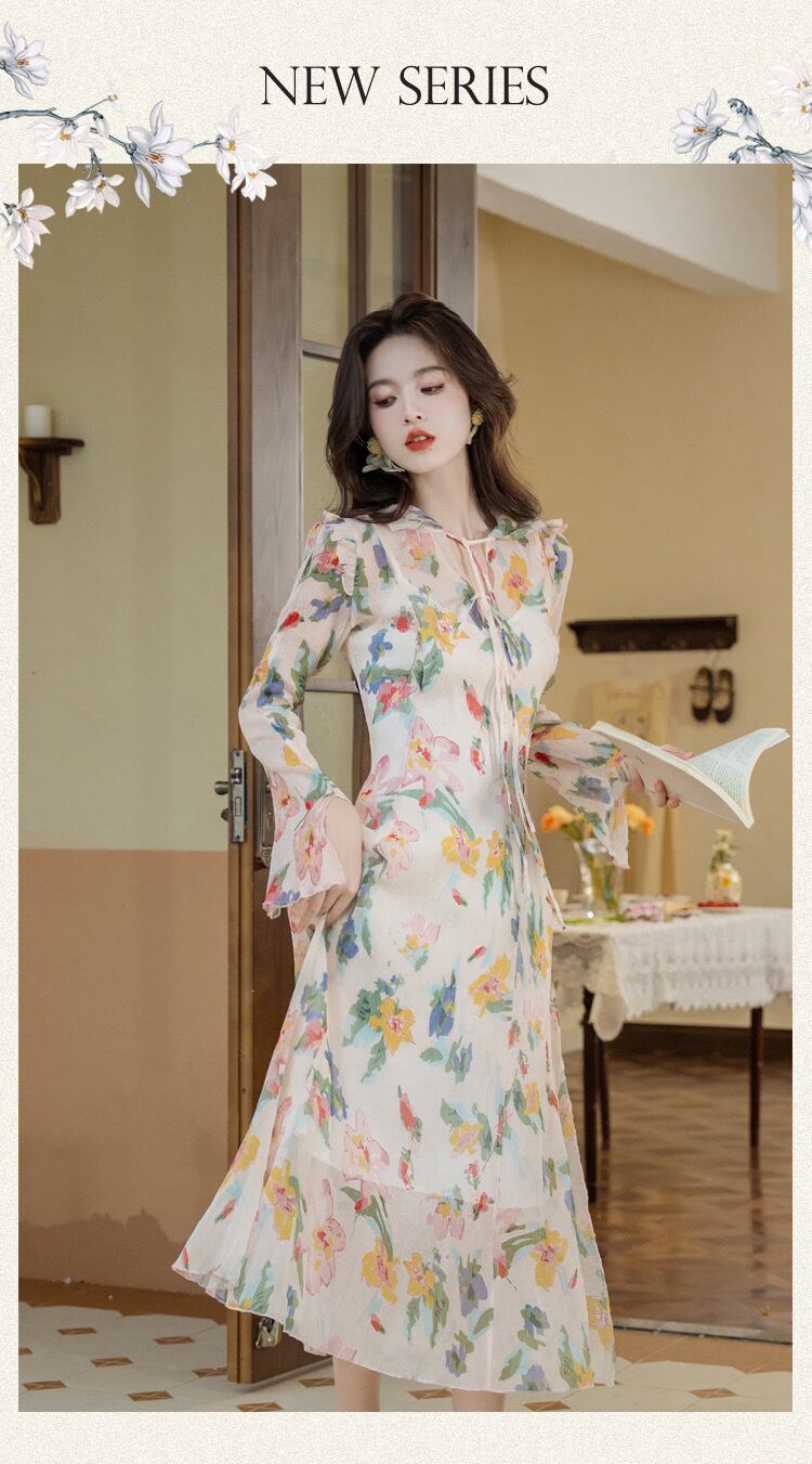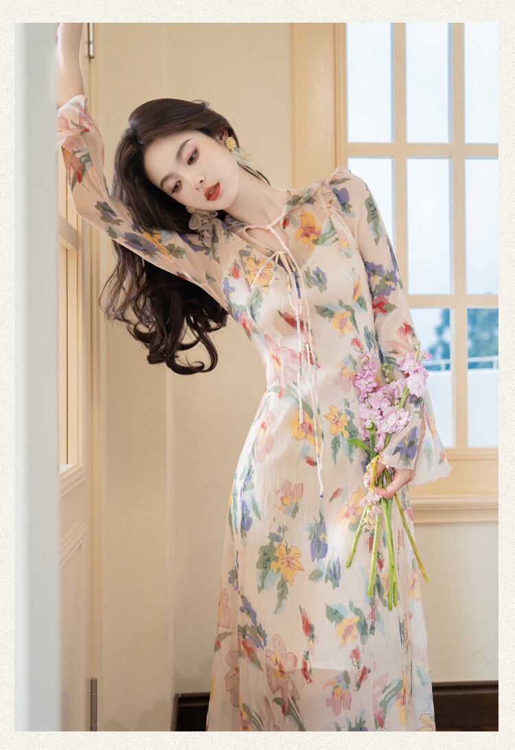 Pinkoz 花柄プリントフリルプリーツミディドレス夏ロングフレアスリーブレースアップエレガント休日 Vestidos ピンク ラッフル サマー 夏物