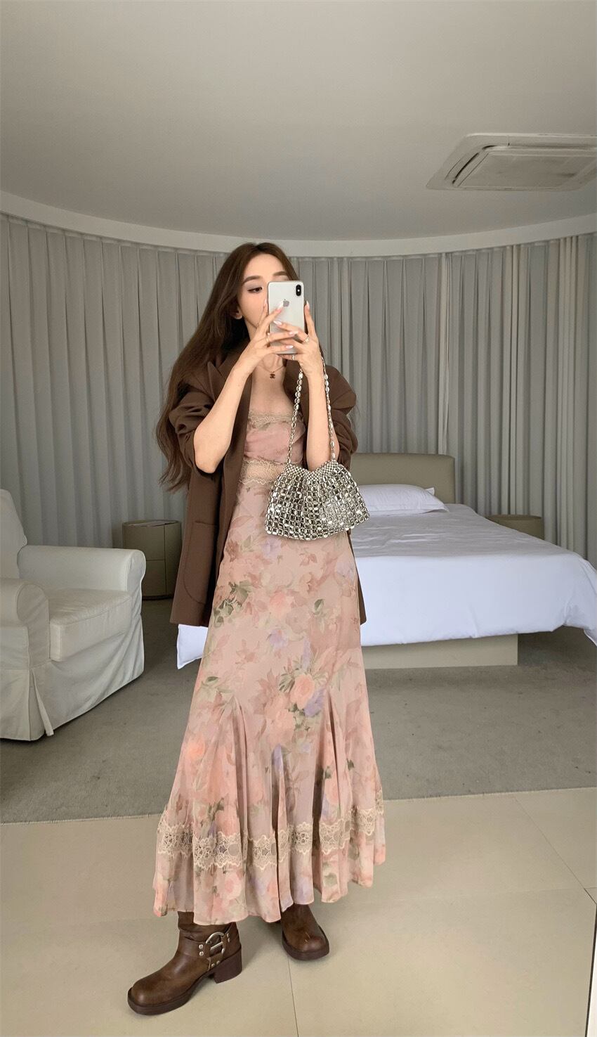 Pinkoz セクシーぬるぬる花柄プリントスパゲッティストラップミディドレスパッチワークレース夏休みファムローブ mujer ピンク サマー 夏物 フェミニン
