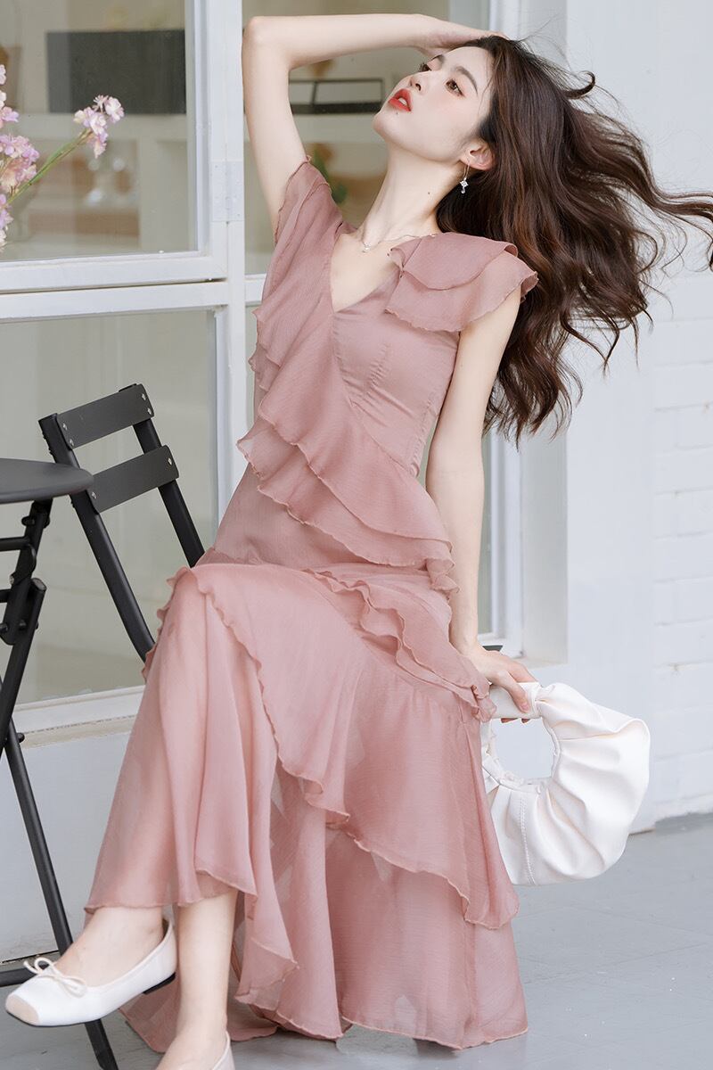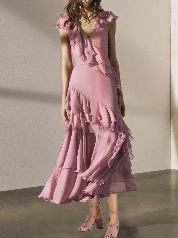 Pinkoz ピンク v ネックフリルパーティーナイトロングドレスイブニングタンク夏シフォンファムドレス不規則誕生日甘い ne ラッフル 大人ガーリー スウィート キュート カジュアル サマー 夏物 Vネック フェミニン