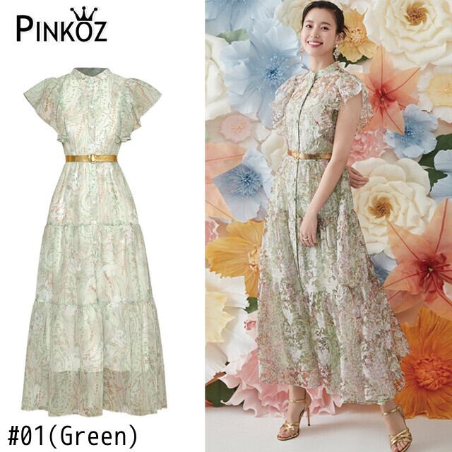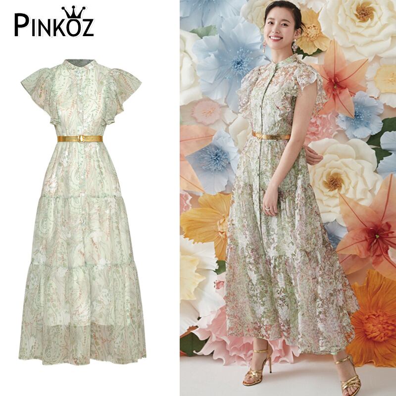 Pinkoz デザイナーグリーン花柄蝶スリーブ夏高級ミディドレス woth ベルトハイストリート服vestidos ピンク サマー 夏物 ハーネス