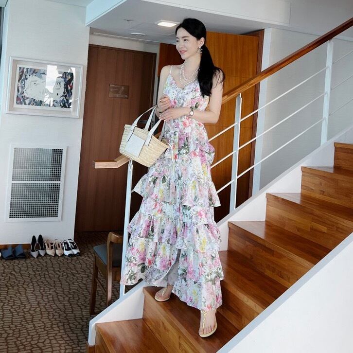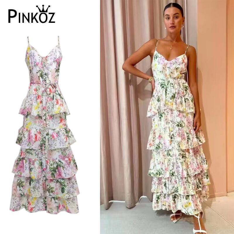Pinkoz デザイナー花柄プリントシングルブレスト V ネックフリルスパゲッティストラップ新デザインファッションシックローブデムジャーボヘミアン ピンク ラッフル Vネック
