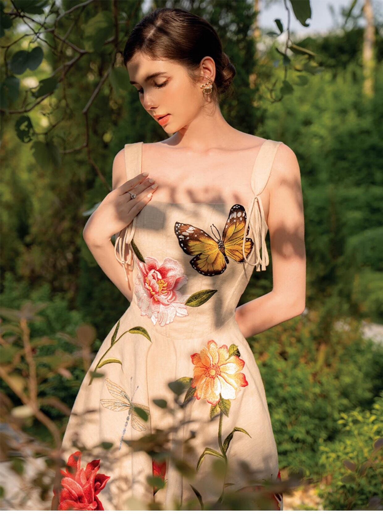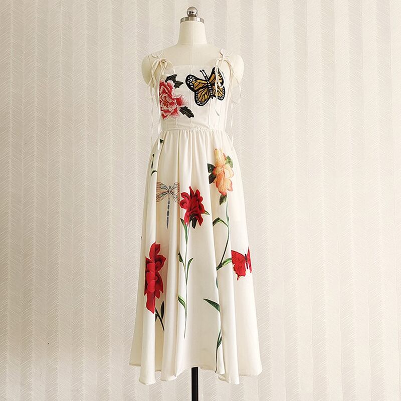 Pinkoz 新人デザイナーマキシドレスベージュ蝶花刺繍スパゲッティストラップレースアップキャミソールナイトパーティードレスローブ ピンク フラワーデザイン