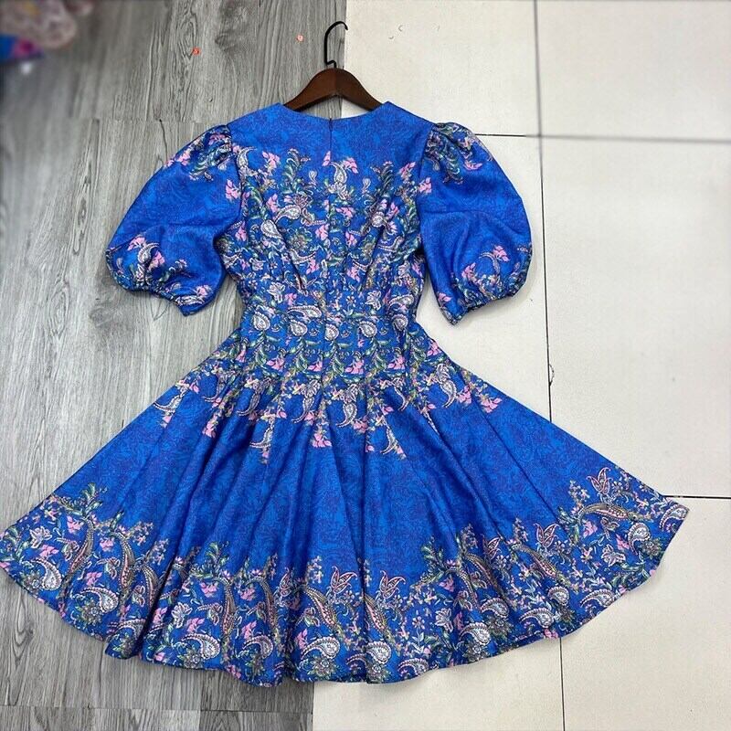 Pinkoz デザイナードレスブルー花柄プリント v ネックボタンパフスリーブミニ A ラインドレスパーティーボヘミアン Vestidos traf ピンク Vネック Aライン