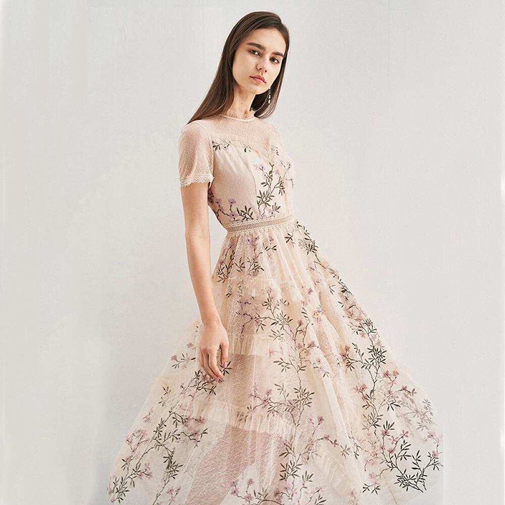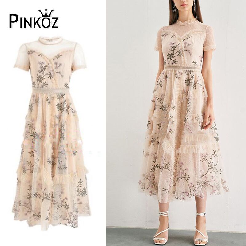 Pinkoz デザイナーベージュ花柄プリントパッチワークメッシュシャーリング高級ミディドレス夏半袖ファッションローブデムジェ新しい ショート ピンク ハーフスリーブ サマー 夏物
