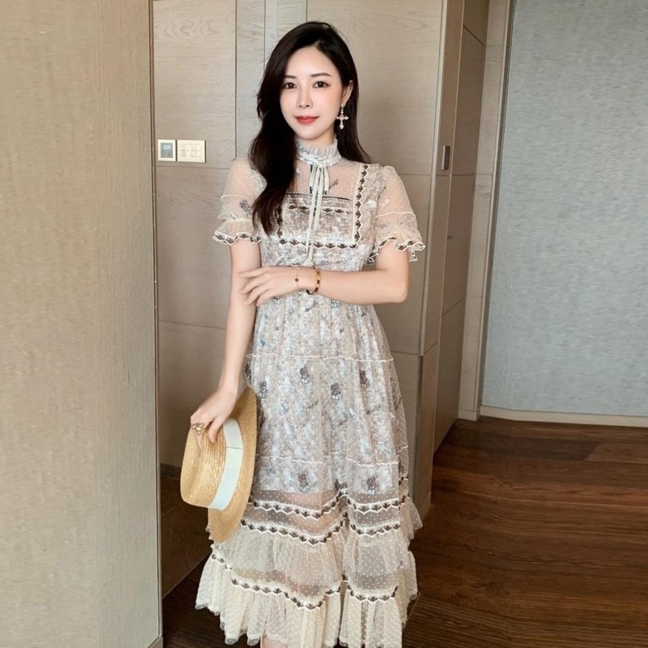 Pinkoz ヴィンテージパッチワークメッシュ花柄プリントミディロングドレスファムレースファッションシックローブデムジェ自由奔放生きる Vestidos traf za ピンク フェミニン ビンテージ