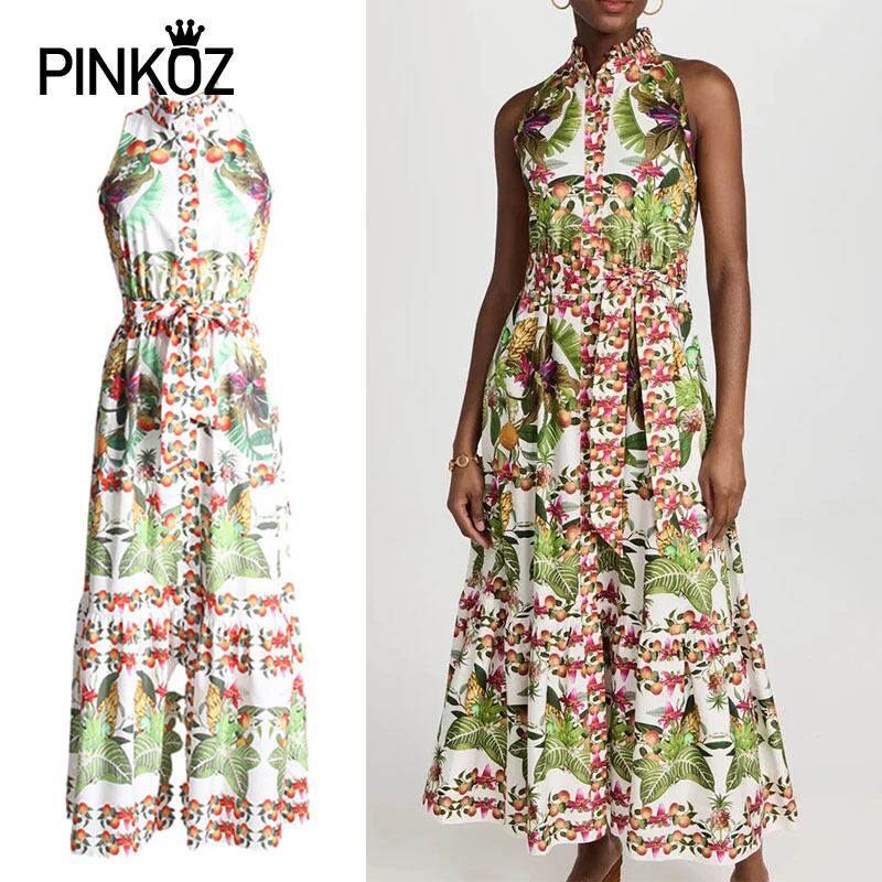 Pinkoz 夏春新ファッションマキシタンクドレスレースアップサッシュデイリーカジュアルナイト花柄 Vestidos ヴィンテージ自由奔放生きる traf ピンク スプリング 春物 サマー 夏物 ビンテージ