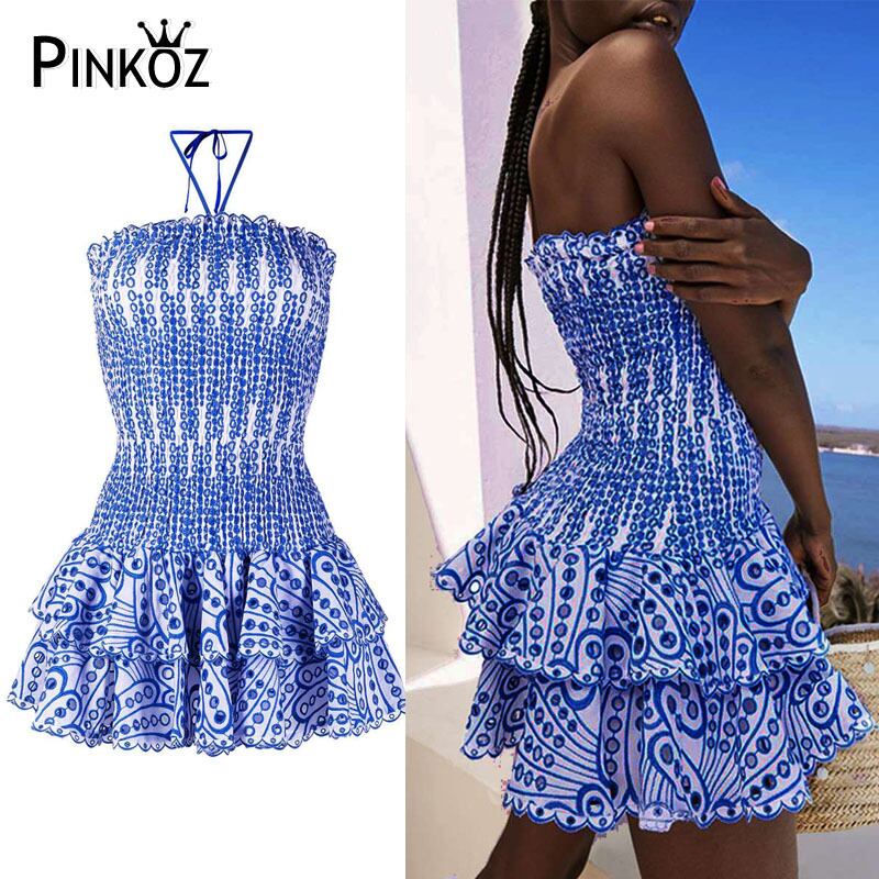 Pinkoz 滑走路デザイナー新しいスタイリッシュ zevity ストラップレス夏ミニドレスレース中空アウトフリルパーティーナイトパリvestidos traf ピンク ラッフル サマー 夏物