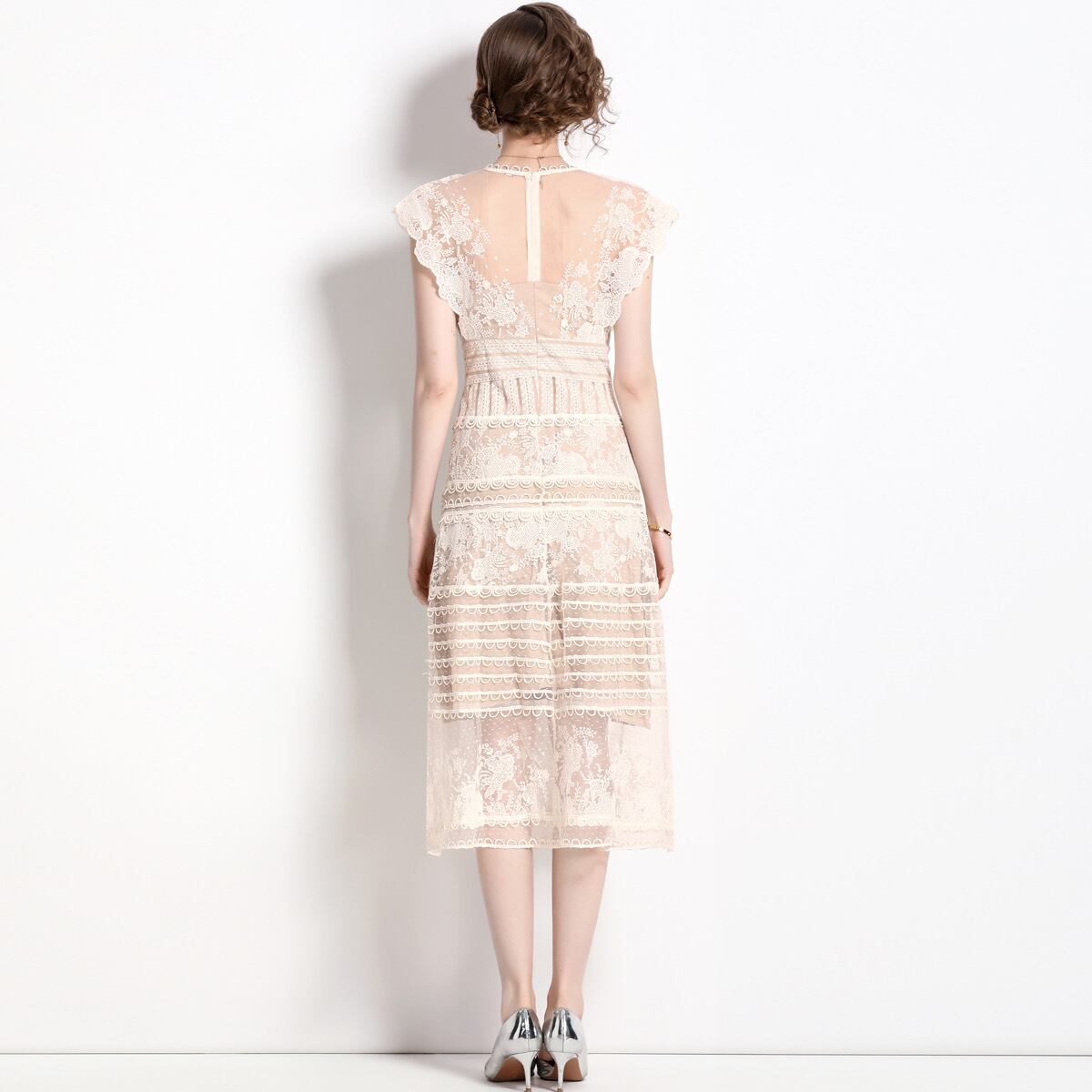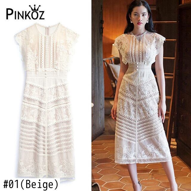 Pinkoz デザイナー新しいミディドレス高級刺繍ベージュパーティー結婚式ロングノースリーブドレス Vestidos ヴィンテージ ピンク 長袖 ビンテージ