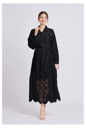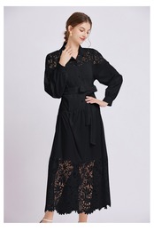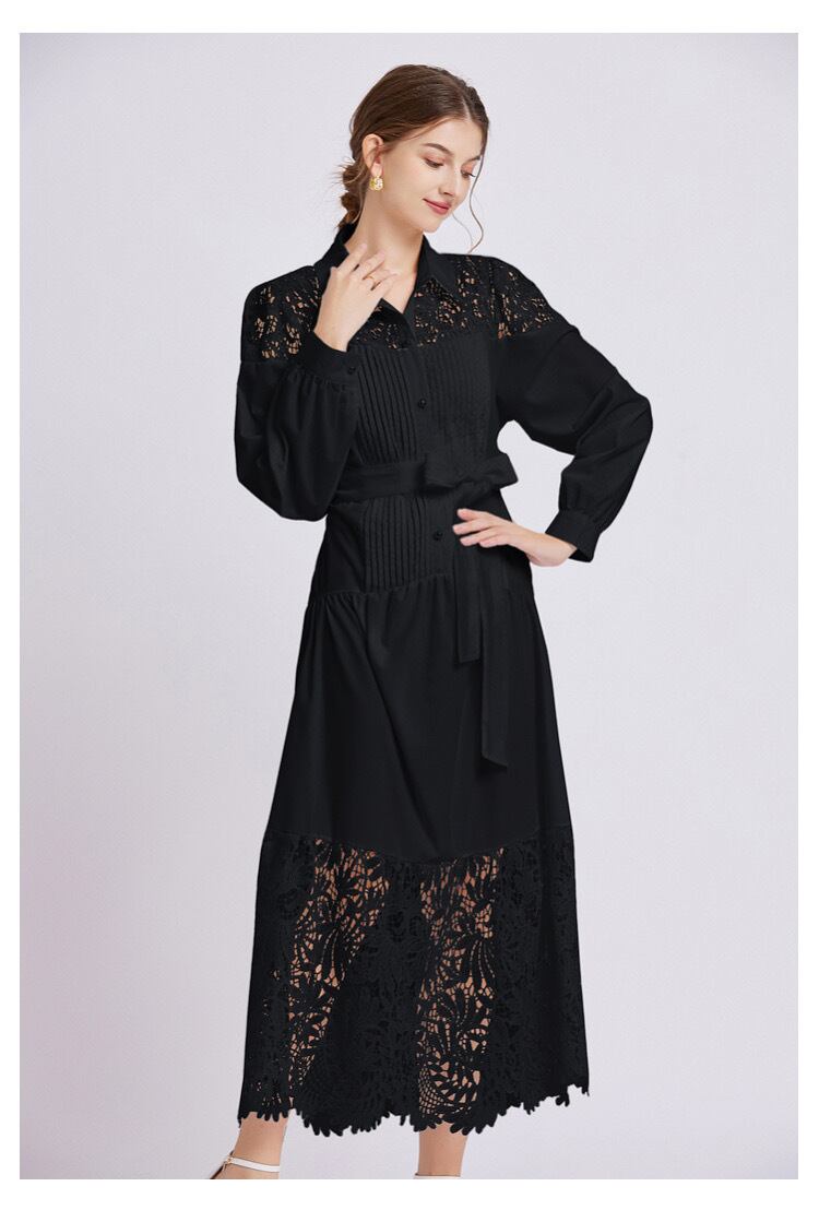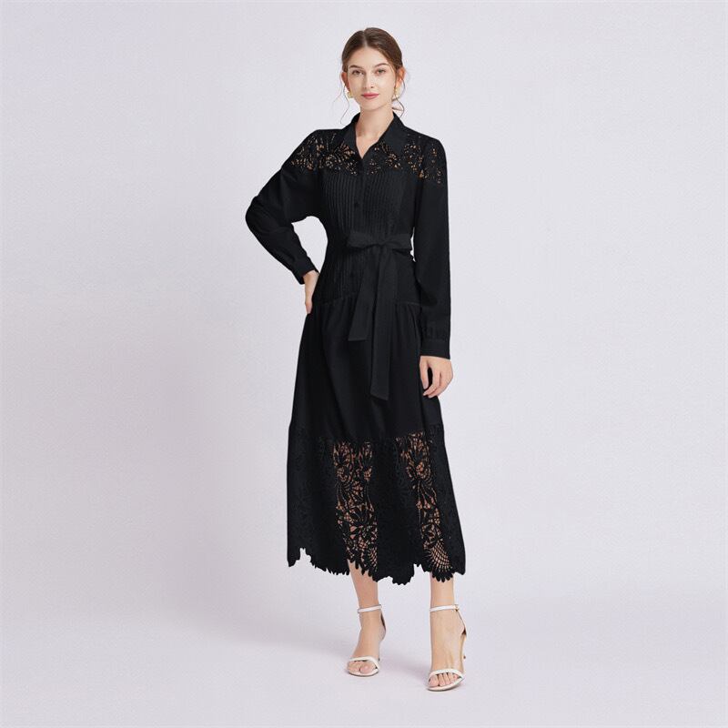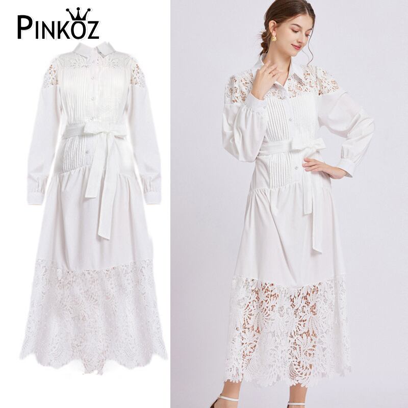 Pinkoz 春秋新ファッション白いドレスパッチワークレース中空アウトターンダウン襟エレガントルーズサイズドレスベルト ピンク ホワイト スプリング 春物 オータム 秋物 ハーネス
