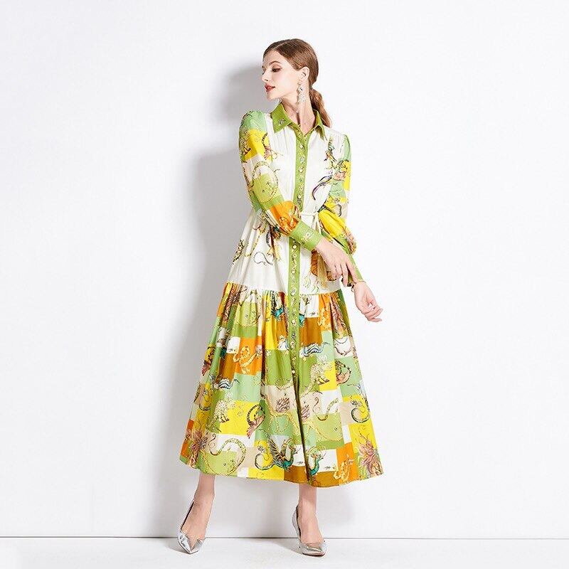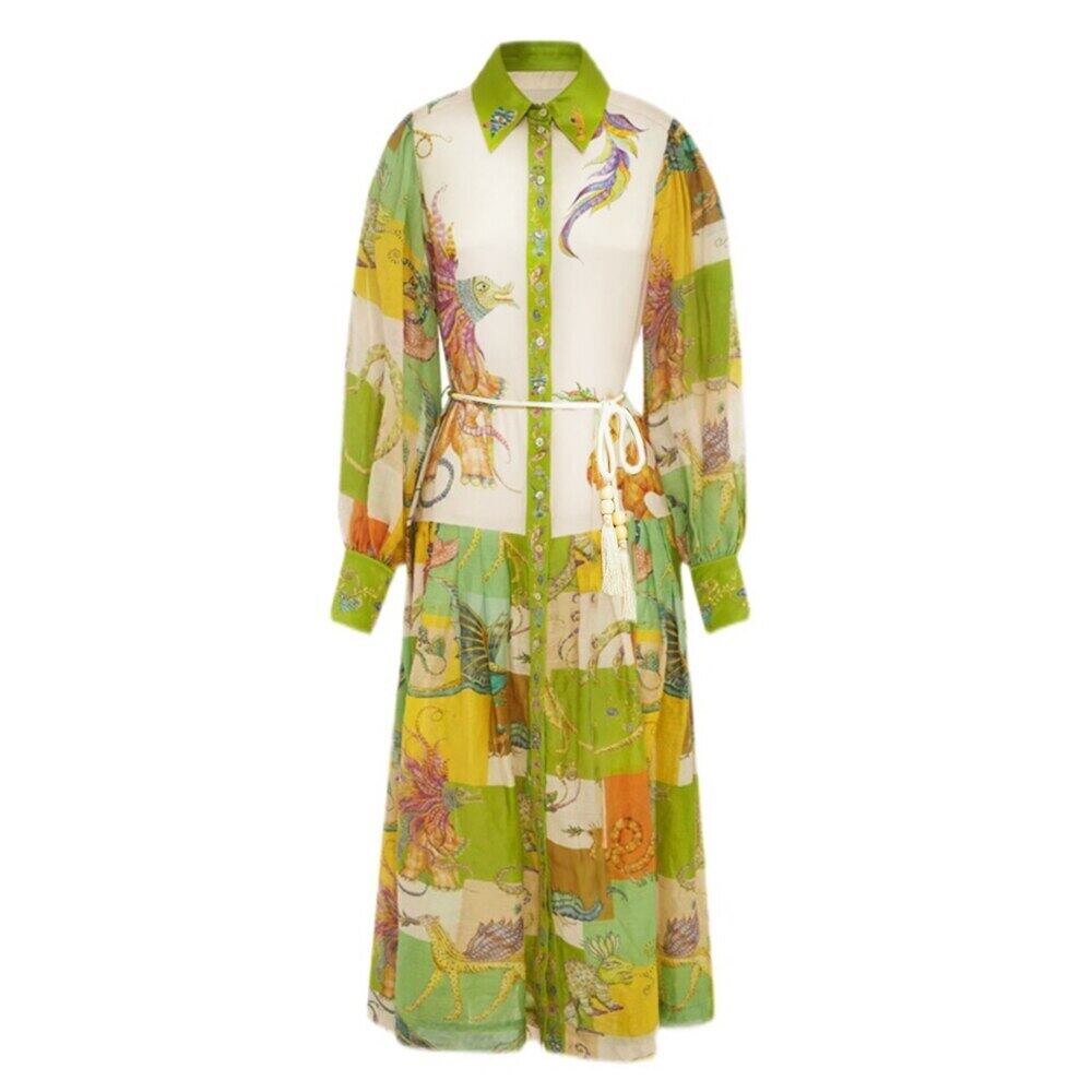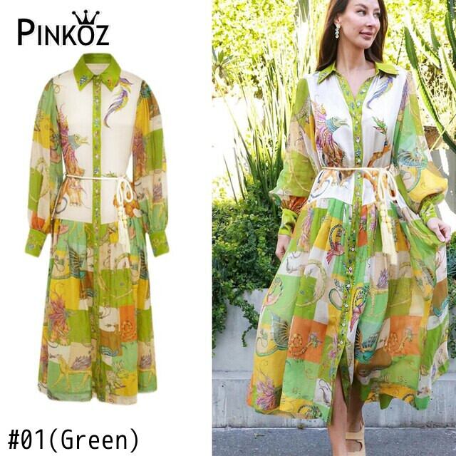 Pinkoz ランウェイデザイナーターンダウン襟グリーン花柄シングルブレストホリデーシックローブデムジャーボヘミアンベストマキシドレス ピンク