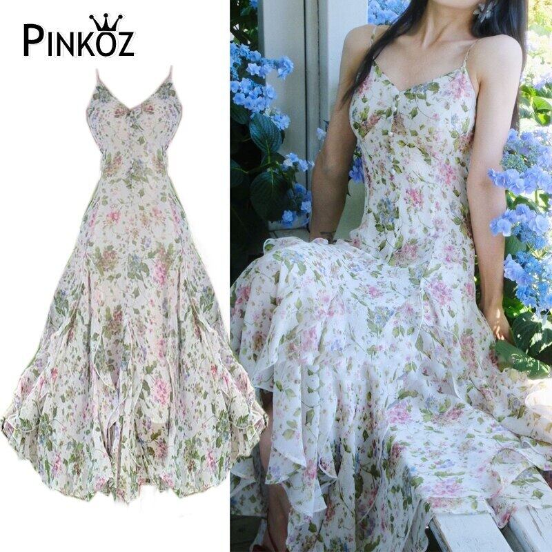 Pinkoz スパゲッティストラップ花柄 v ネック不規則ミディドレスボタンホリデーシックローブデムジェ Vestidos traf ヴィンテージ新しい ピンク プリント Vネック ビンテージ