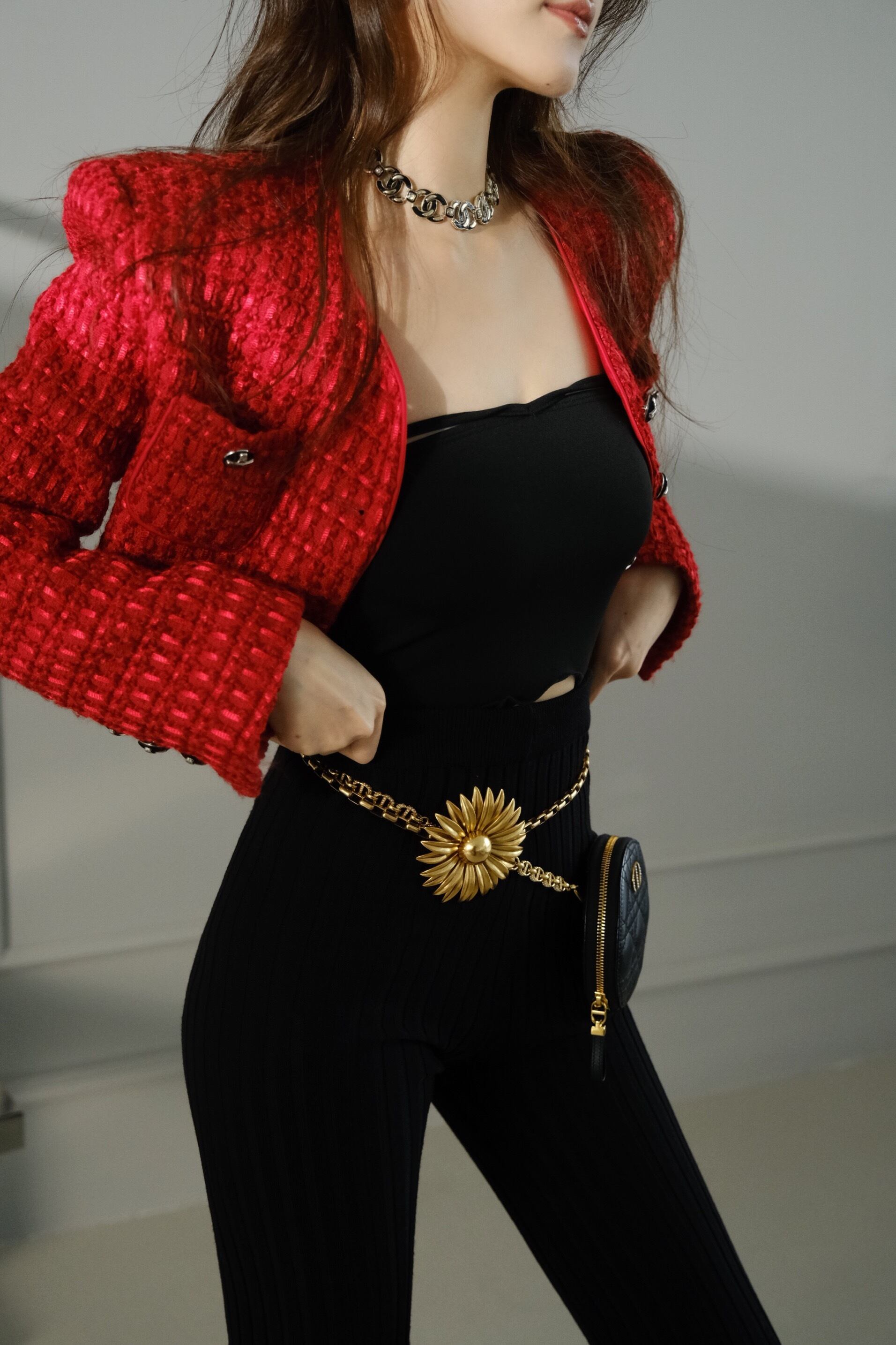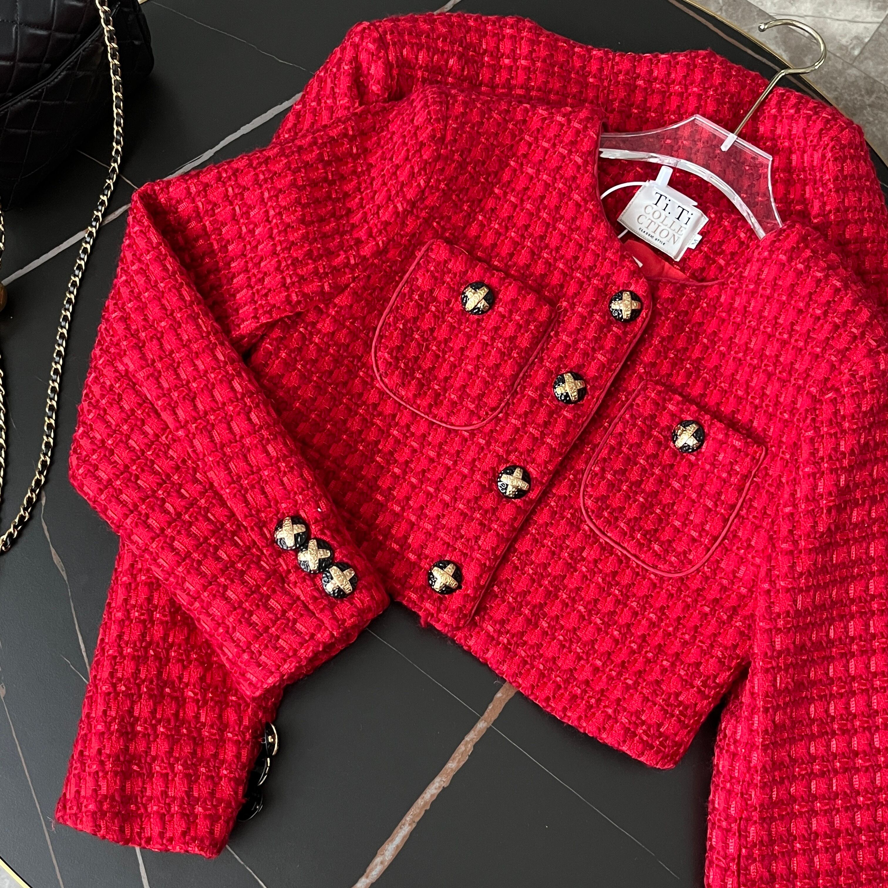 Pinkoz ヴィンテージ赤ショートトップスツイード秋冬長袖ジャケットファッションクリスマスフェスティバル服かわいい zevity ロング ピンク レッド 大人ガーリー スウィート キュート カジュアル オータム 秋物 ウィンター 冬物 ビンテージ